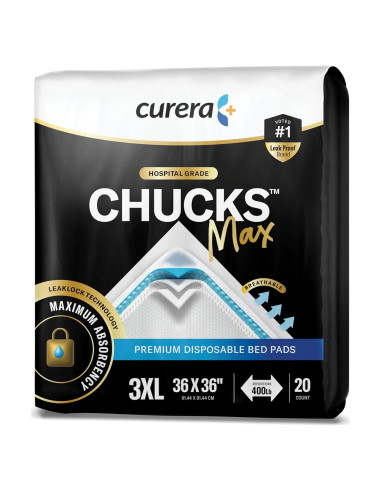 - MÁXIMA ABSORCIÓN - Diseñadas con Tecnología LeakLock y relleno de perlas de polímero avanzado, las almohadillas CHUCKS MAX absorben más rápido y retienen más líquido que las almohadillas estándar - bloqueando la humedad y controlando el olor para una sequedad durante toda la noche. Diseñadas para adultos con incontinencia, fugas posparto y enuresis, este sistema de 5 capas mantiene la piel seca y las camas protegidas. Incluye 2 bolsas de 10 almohadillas cada una.
