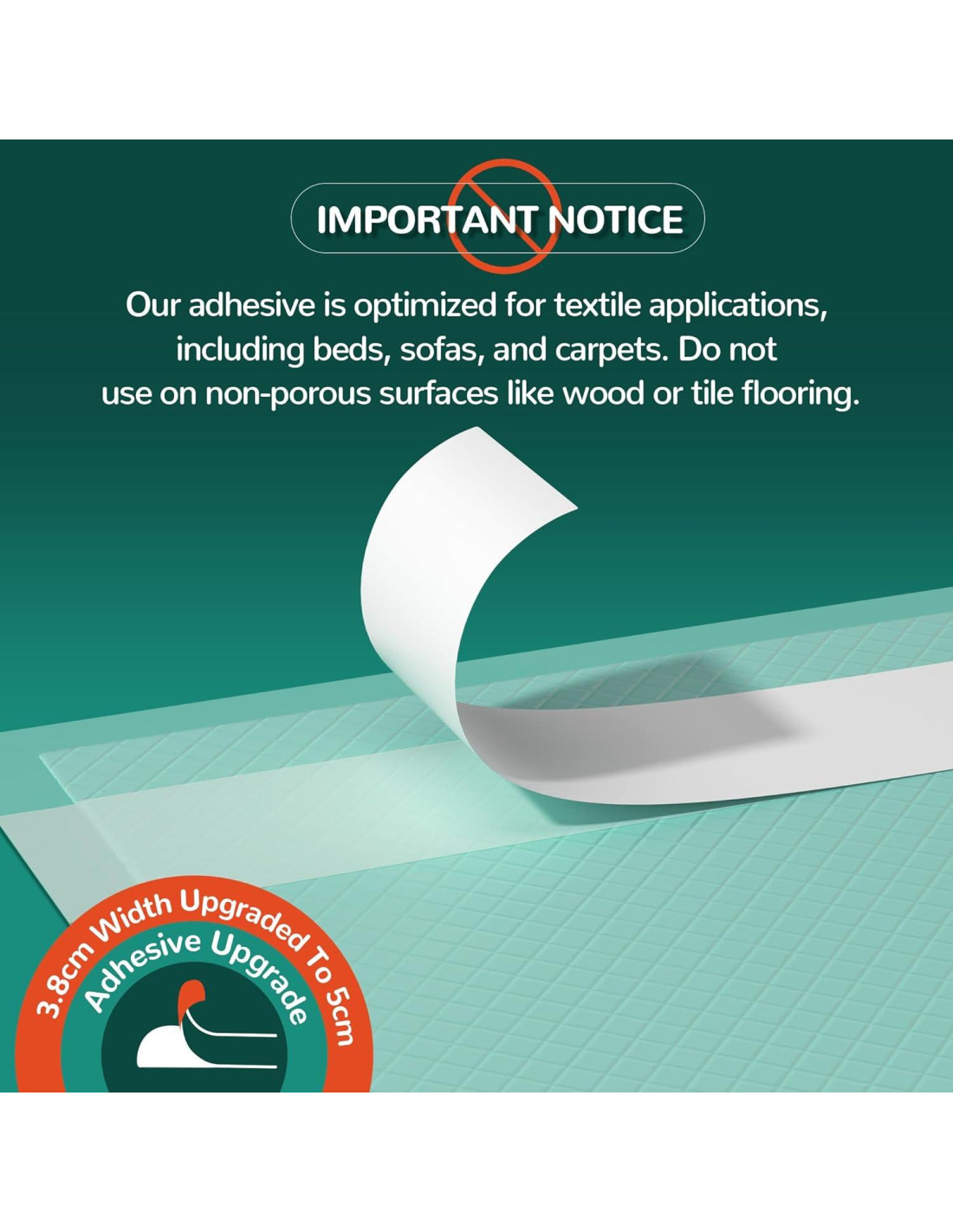 - Respaldo adhesivo: Usamos dos tiras adhesivas anchas en la parte posterior de la almohadilla para asegurar que no se mueva aleatoriamente. Si queda respaldo adhesivo en la superficie es normal, usa agua tibia o toallitas húmedas para quitarlo, por favor no te preocupes por dañar tus sábanas o sofá