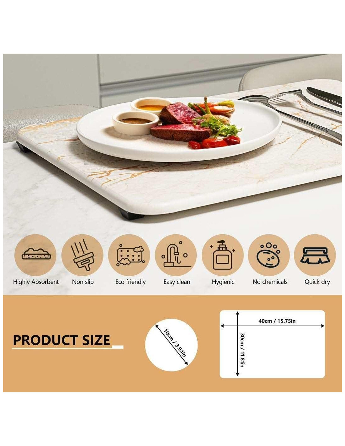 - Moderna y Versátil: Lo que hace que nuestra bandeja de fregadero de piedra de secado rápido sea realmente asombrosa es el lujoso diseño de mármol blanco dorado y la estética elegante que se verá impresionante en cualquier rincón de tu hogar. Úsala con confianza como una alfombrilla de secado de platos, alfombrilla protectora para encimera, áreas de baño o mascotas, bandeja de fregadero o bandeja organizadora.