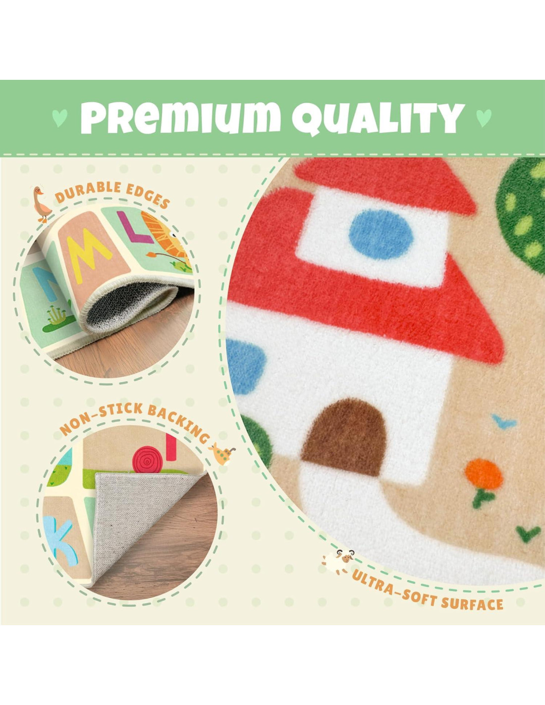 - ALFOMBRA ALFABÉTICA DIVERTIDA Y EDUCATIVA: Esta suave alfombra ABC introduce a tu pequeño al alfabeto a través de ilustraciones alegres como manzanas, leones, autos y caracoles. Es una forma divertida de aprender letras, sonidos y vocabulario durante el tiempo de juego