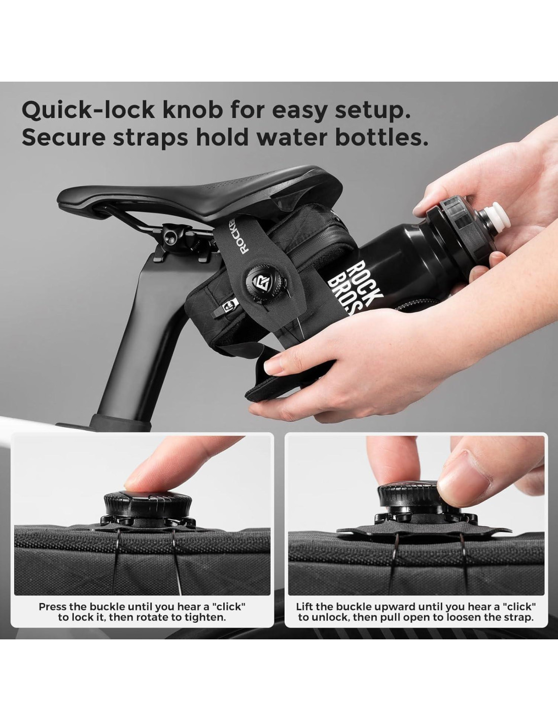 - Diseño de Cierre de Bloqueo por Giro: Hebilla de bloqueo por giro de instalación rápida se asegura firmemente al sillín. Se mantiene firme sin temblar durante los paseos; incluye correas para una fijación adicional de la botella de agua.