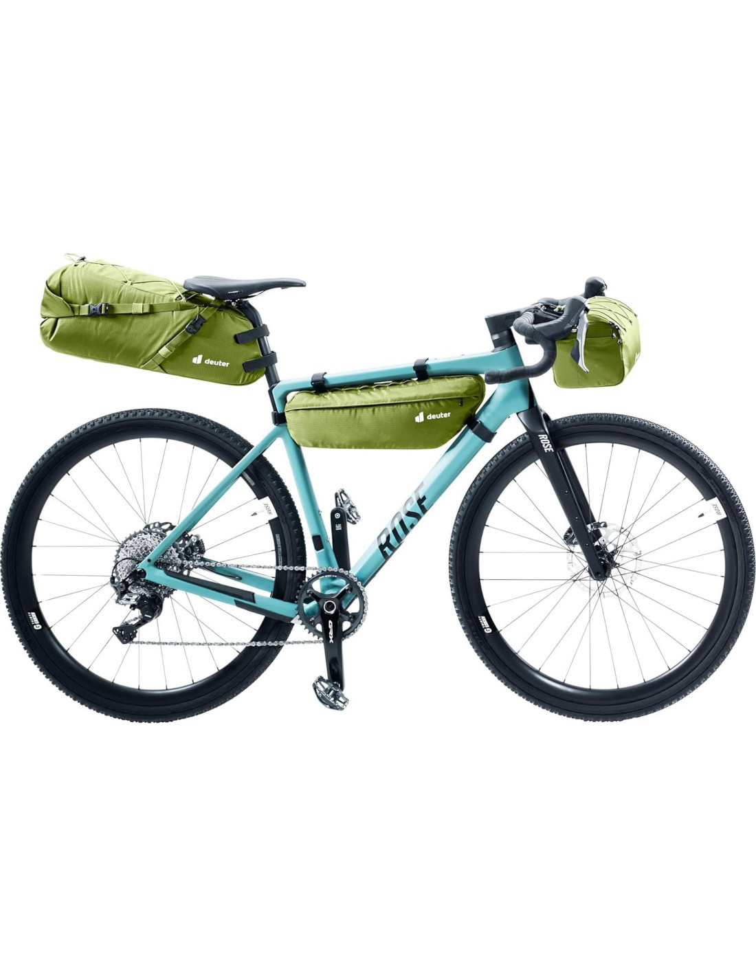 Una bolsa de sillín para comenzar en el bikepacking, hecha de material duradero, reciclado y aprobado por bluesign, con un cordón elástico y un bolsillo de malla en la parte superior para adjuntar artículos de fácil acceso, y con una base reforzada y detalles reflectantes.