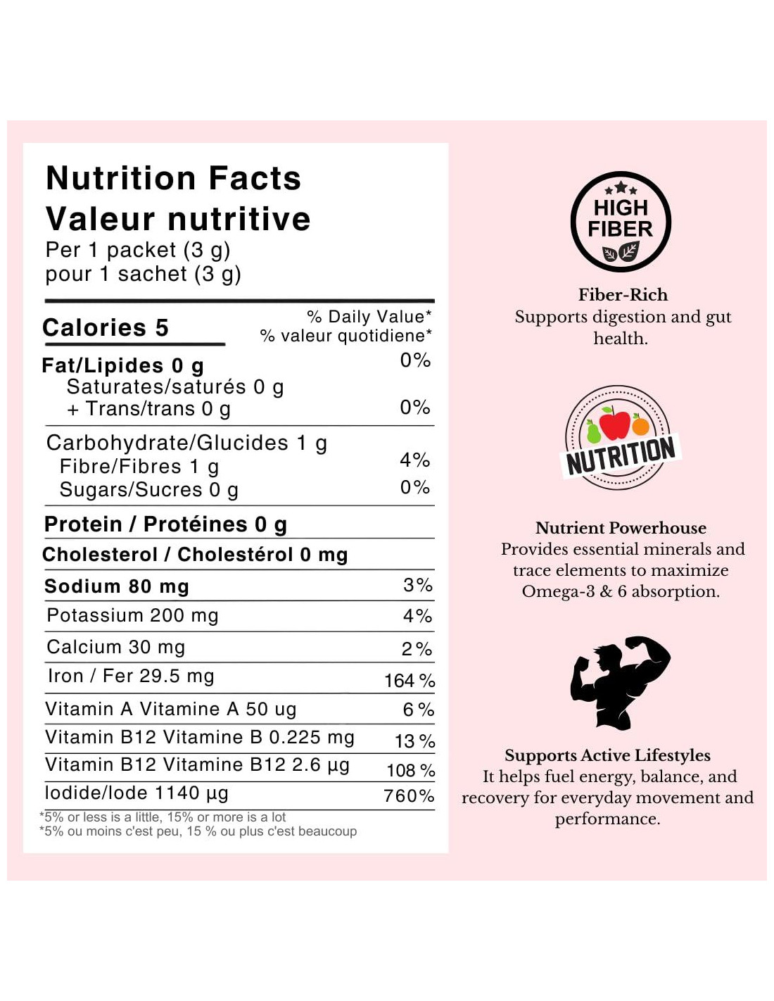 - Apoyo a la Tiroides y Detox: Una fuente natural de yodo para nutrir la salud de la tiroides y el metabolismo. También contiene ácido algínico para ayudar a eliminar metales pesados y apoyar una detoxificación suave.