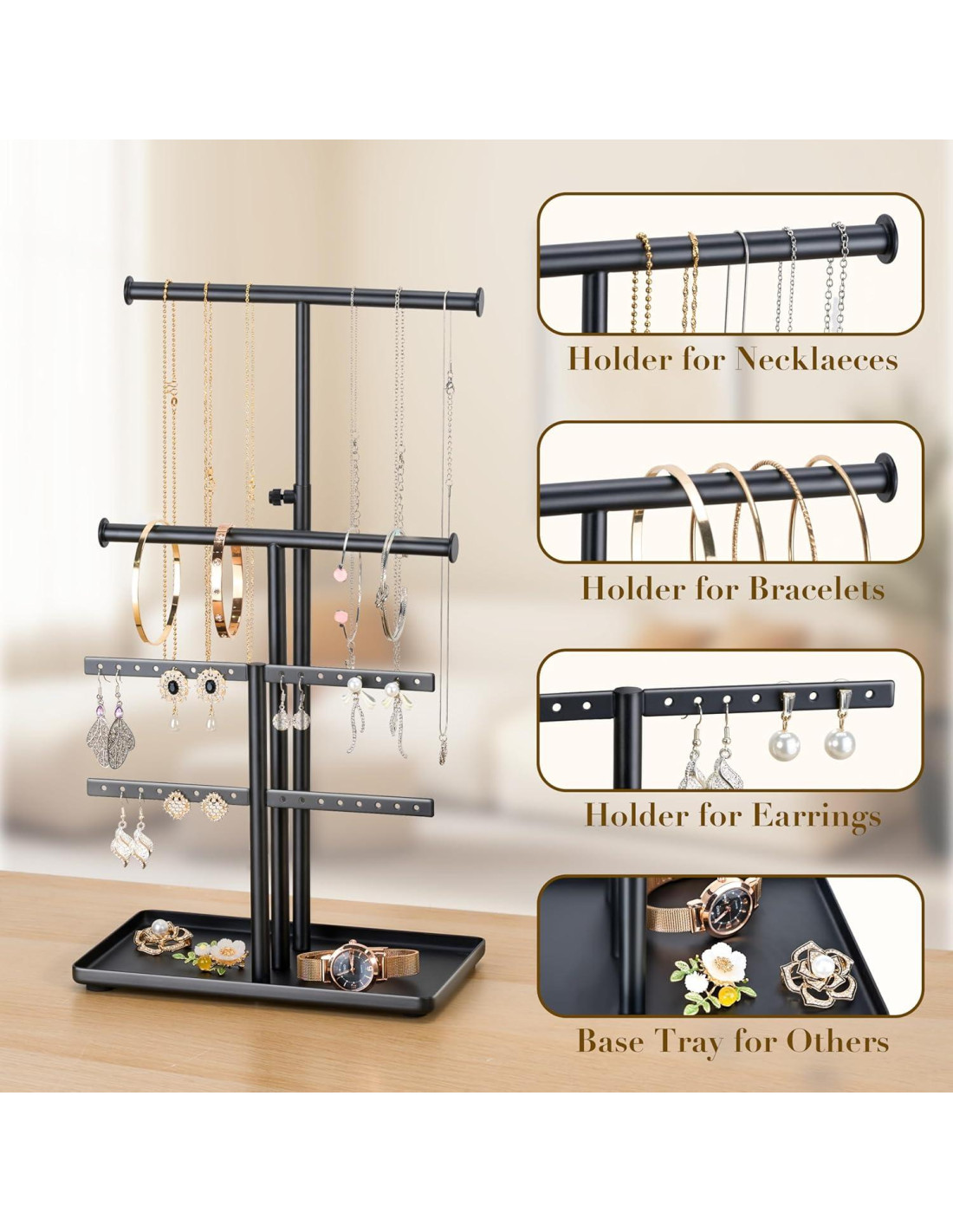 - 3 Niveles de espacio de almacenamiento - Encuentra la joya que deseas de un vistazo. El soporte puede almacenar collares, pulseras, pendientes, y la bandeja puede almacenar cosméticos, anillos, broches, etc.