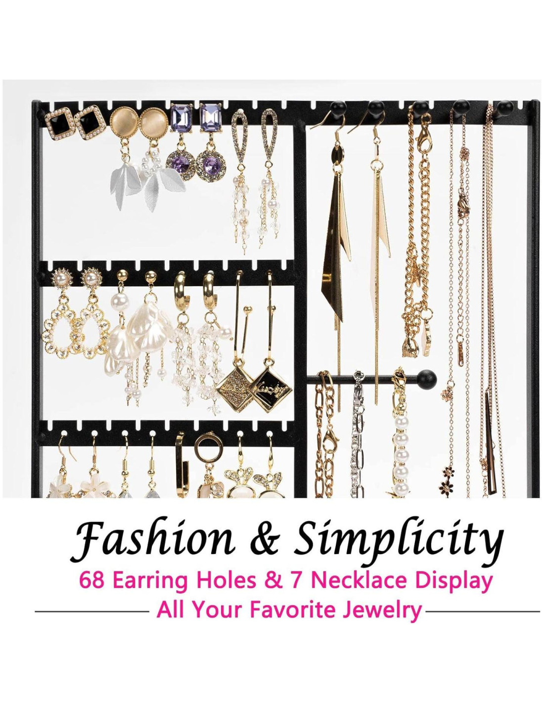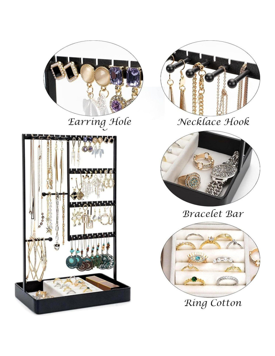- Gran Almacenamiento: Ya sea que lo llames soporte organizador de pendientes, organizador de joyería o soporte para collares, estamos orgullosos de organizar y exhibir tu preciosa joyería. Barra de pendientes de 4 niveles con 67 agujeros puede recibir cualquier tipo de pendiente. 7 postes de metal pueden colgar collares y pulseras, la bandeja de metal puede colocar otros accesorios. Diferentes medios de recepción significan recibir diferentes artículos de adorno, más conveniente buscar