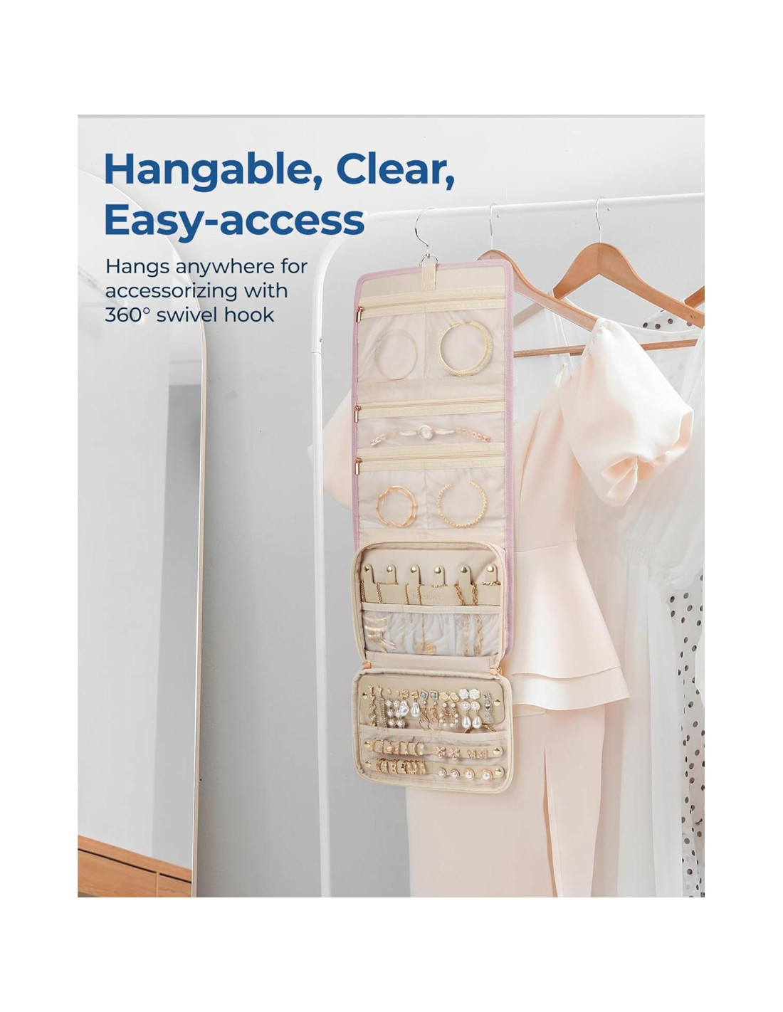 - [Comodidad de Viaje] : Este organizador de joyas se pliega ordenadamente a un tamaño compacto de 19 x 5 x 25.5 cm. Cuenta con características como un gancho giratorio de 360, asas dobles resistentes y tela resistente a salpicaduras para garantizar la seguridad de tus artículos, perfecto para empacar en cualquier bolsa o maleta para un viaje sin esfuerzo a cualquier destino.