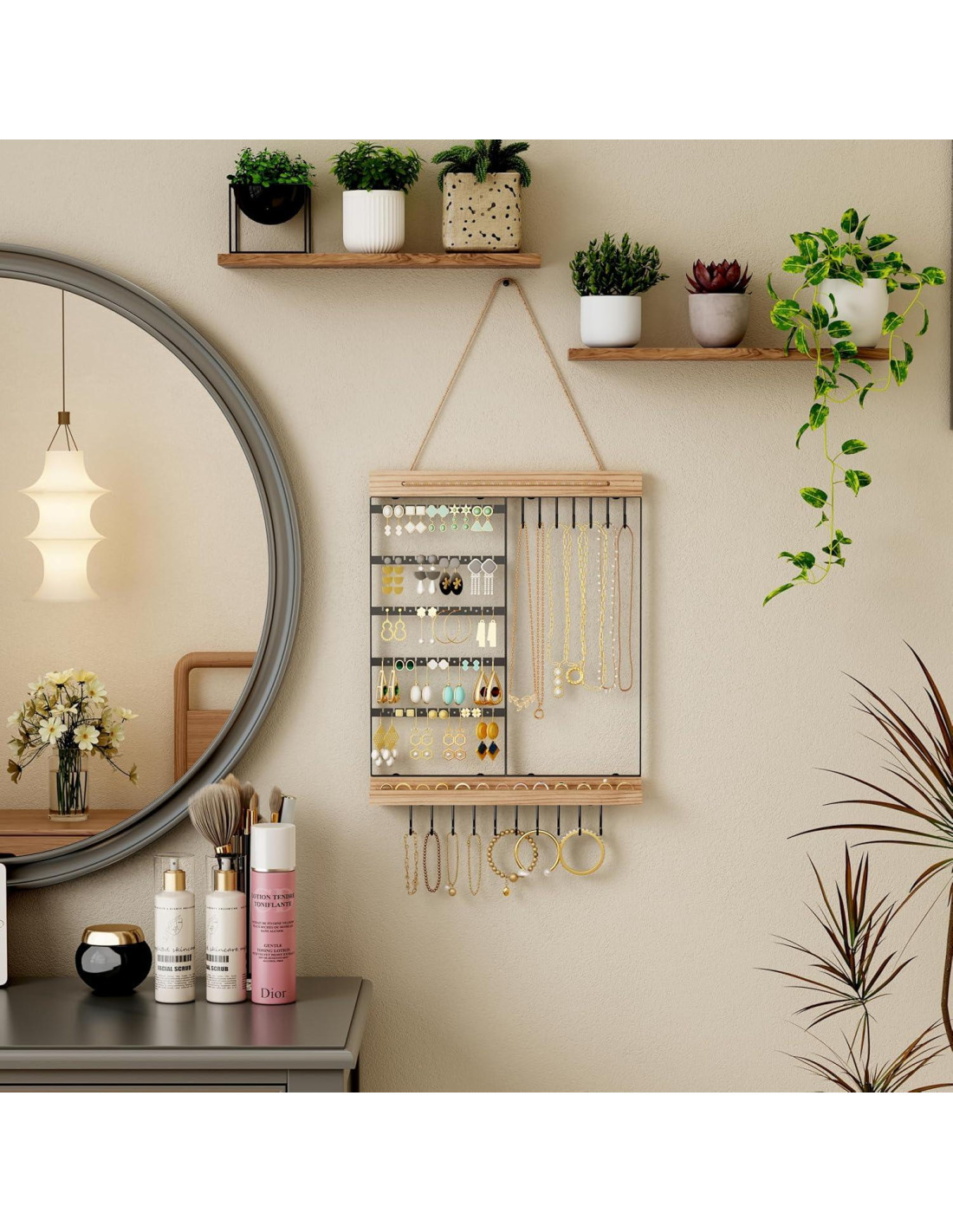 Con un estante de joyería de super almacenamiento, estante para pendientes, estante para collares, estante para pulseras y estante para anillos en uno, puede resolver todos sus problemas de almacenamiento de joyería. Colgado junto al espejo, fácil de recoger, no fácil de mojar, el tiempo de conservación de la joyería es más largo. Cuélguelo en la pared del tocador para liberar más espacio en la encimera para almacenar otros artículos; todos los accesorios están agrupados y se pueden combinar a voluntad. Colóquelo en el área de exhibición, tanto hermoso como útil, la combinación perfecta de arte y practicidad, se puede ver de un vistazo, llama la atención.