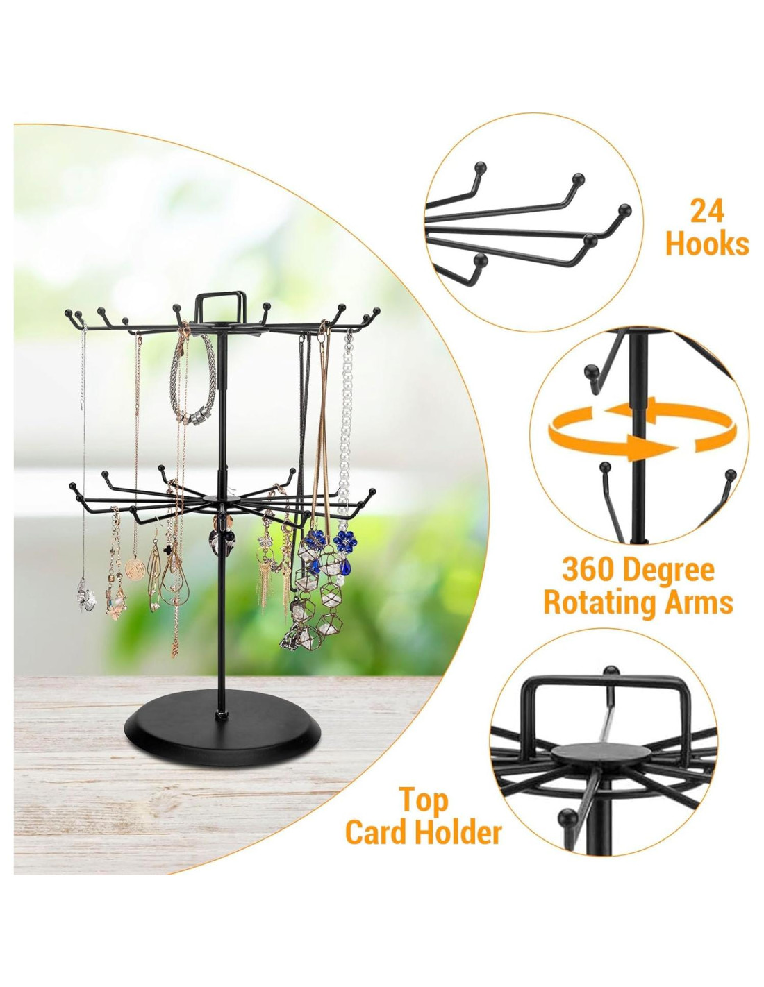 - Tanto el nivel superior como el inferior cuentan con 12 ganchos cada uno y giran 360 grados, mientras que el nivel superior está diseñado con un soporte para fotos, tarjetas de presentación o un simple soporte para clips de cabello; Perfecto para sostener una variedad de collares y pulseras de tu colección personal, entornos minoristas o ferias de artesanía