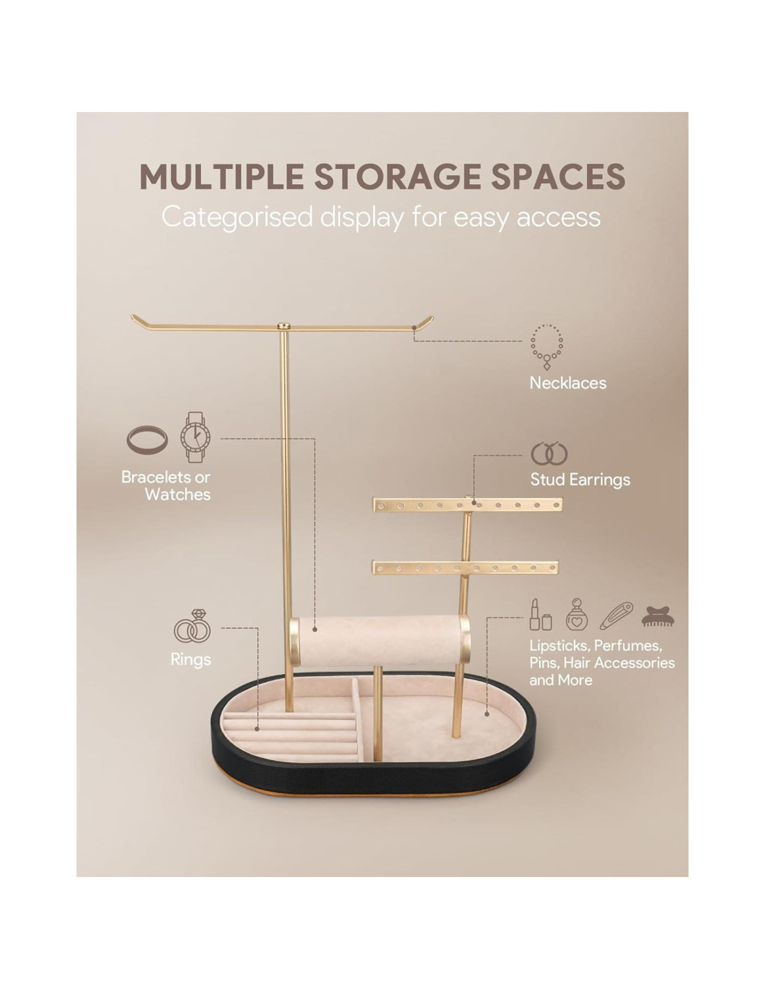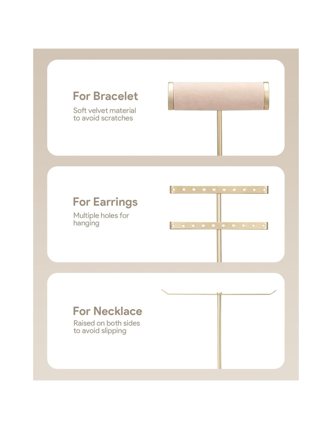 - Combinación de Materiales Múltiples: material de terciopelo, delicado y suave, protege efectivamente la pulsera de rasguños; el marco de metal proporciona suficiente espacio para almacenar ordenadamente collares, pulseras, aretes y más