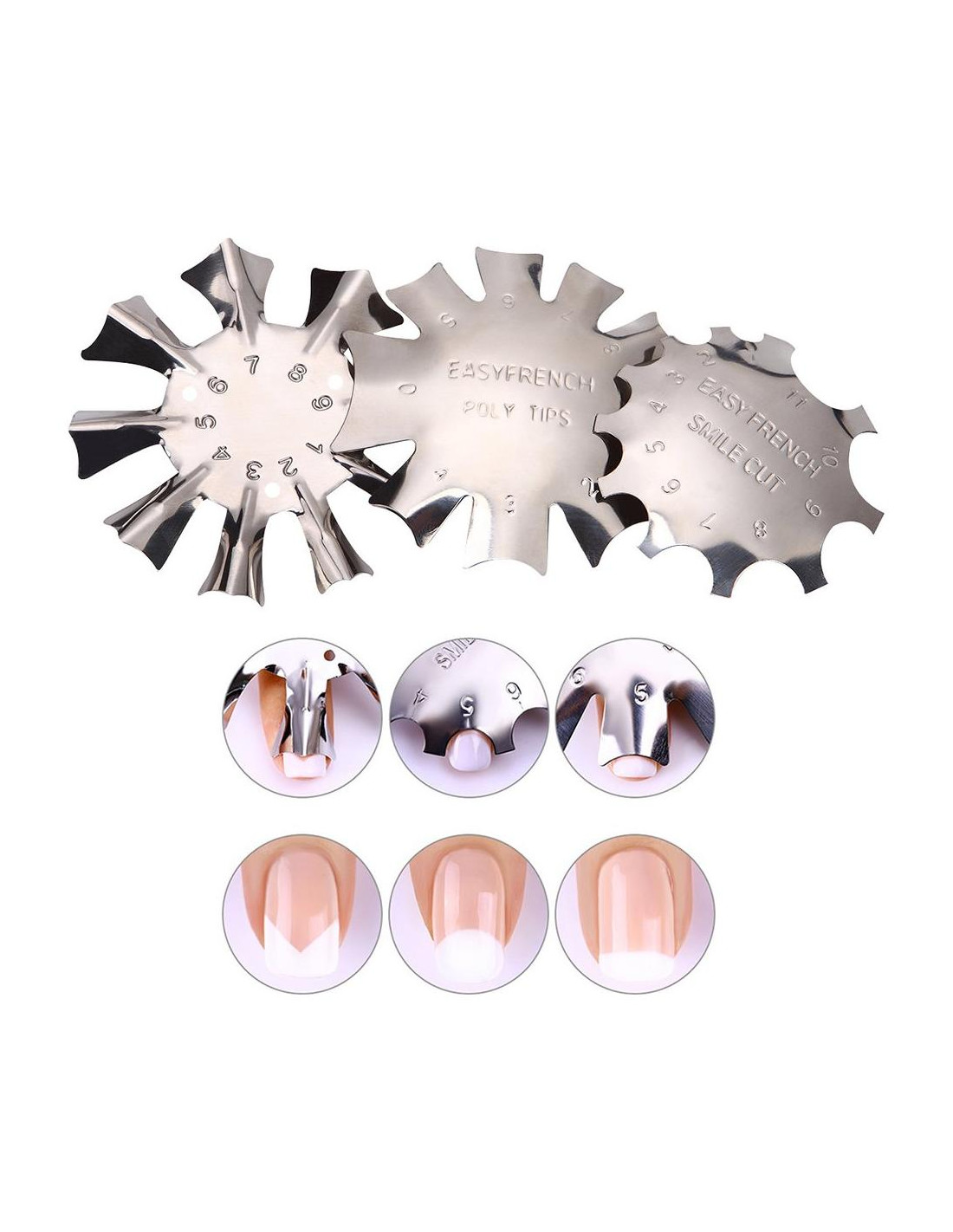 Especificación: 100% nuevo al por menor Material: Acero inoxidable Cantidad: 3 Pcs Tamaño: 3 Pcs de molde cortador, con diferentes formas y tamaños en cada molde como se muestra en las imágenes Contenido del paquete: 3Pcs Cortador de Bordes de Línea de Sonrisa Francesa Fácil Cómo usar: 1. Aplica una capa de esmalte transparente en la cama de la uña. 2. Deja que el acrílico rosa o blanco se seque durante unos 15 segundos antes de aplicarlo en la cama de la uña. 3. Usa esta herramienta francesa fácil para cortar una línea perfecta. 4. Aplica el otro color en la línea.