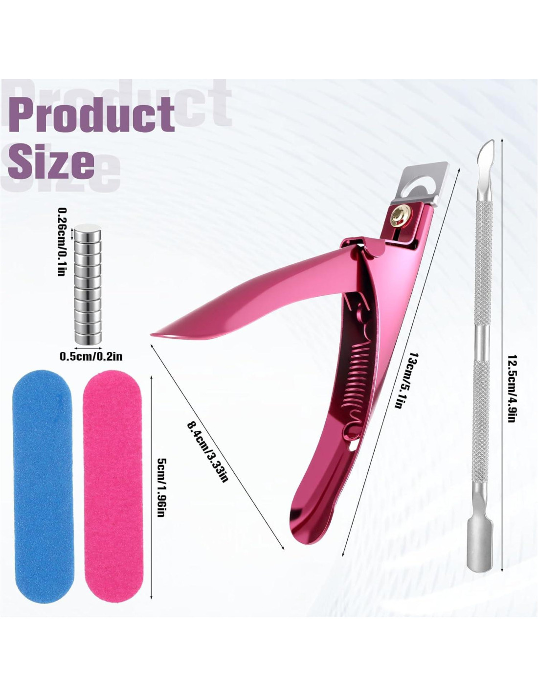 ---------- BIENVENIDO A NUESTRA TIENDA ---------- Lista de empaque: 1 cortador de uñas + 10 imanes + 1 empujador de acero + 2 limas Nombre del producto: cortador de uñas de titanio en forma de U Material: acero inoxidable Color: rosa claro Tamaño del producto: Ver la imagen de la lista, se acepta un ligero error de tamaño Tamaño del empaque: 20 x 12 x 1.9 cm (7.87 x 4.72 x 0.75 pulgadas) Empaque de llegada: bolsa OPP
