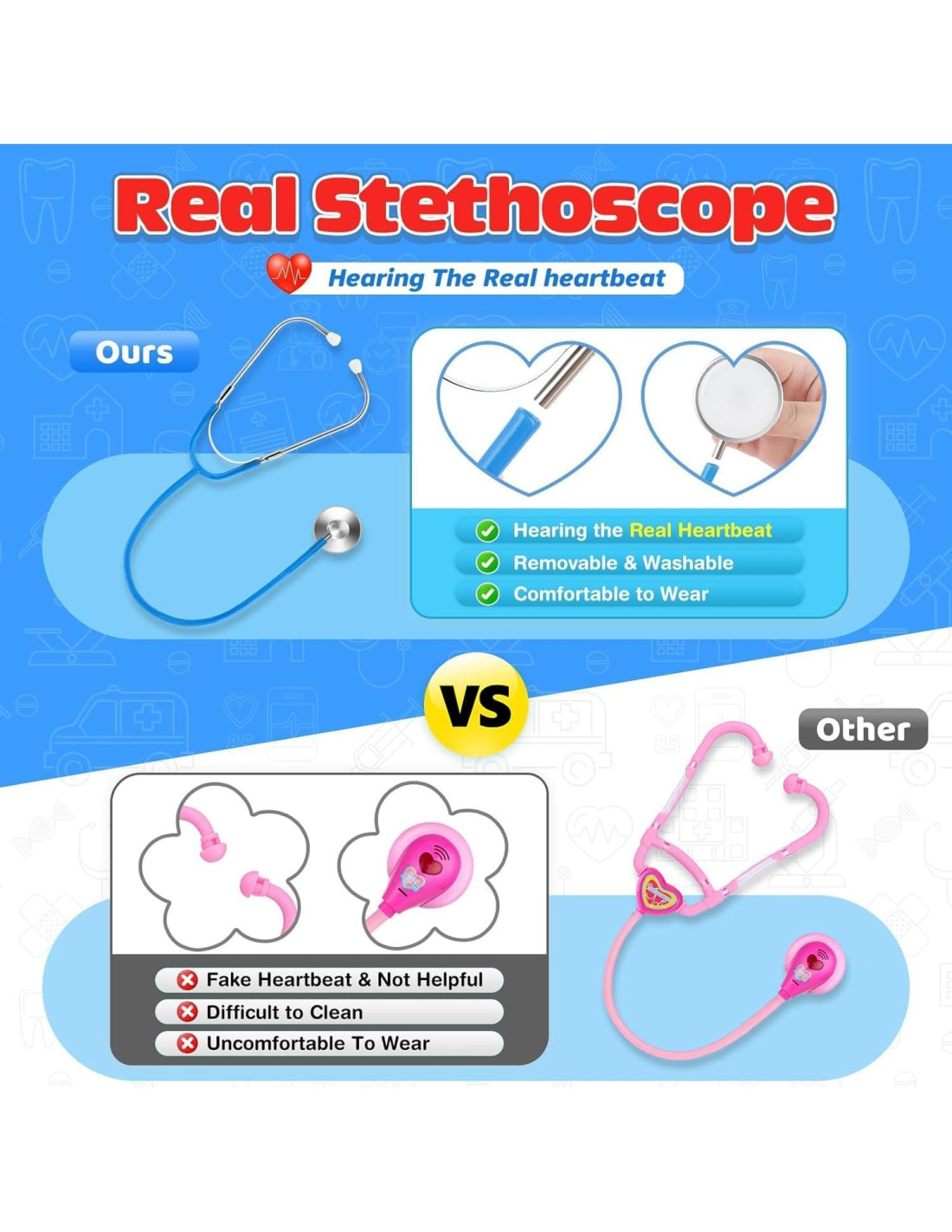 - [Kit de Doctor para Niños con Estetoscopio Real] El Kit de Juego de Doctor GIFTINBOX para Niños Pequeños de 3 a 5 Años viene con un estetoscopio real que puede escuchar sonidos reales del corazón. Escuchar su latido o el de sus familias no solo es muy interesante para los niños, sino que también les ayuda a aliviar su ansiedad y a mitigar su miedo de ir al doctor. Crea horas de diversión jugando con el kit de disfraz de doctor.