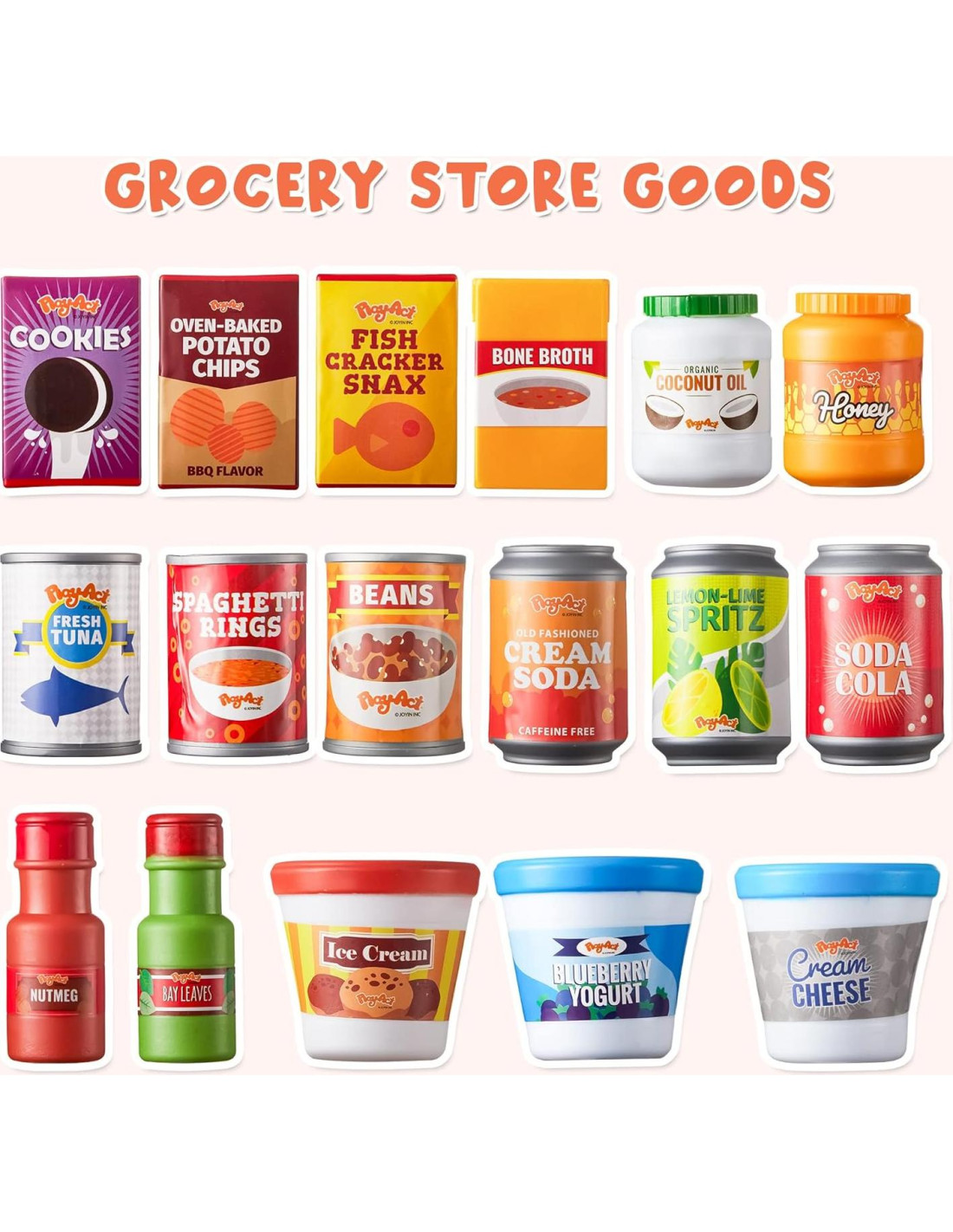 - SUPER VALOR. Este conjunto de alimentos de juguete incluye 30 piezas de productos enlatados para niños pequeños y niños. El conjunto incluye bebida, jugo, sazonador, botella de agua, salsa, yogur, helado, caldo, tarro y caja de snacks, y más.