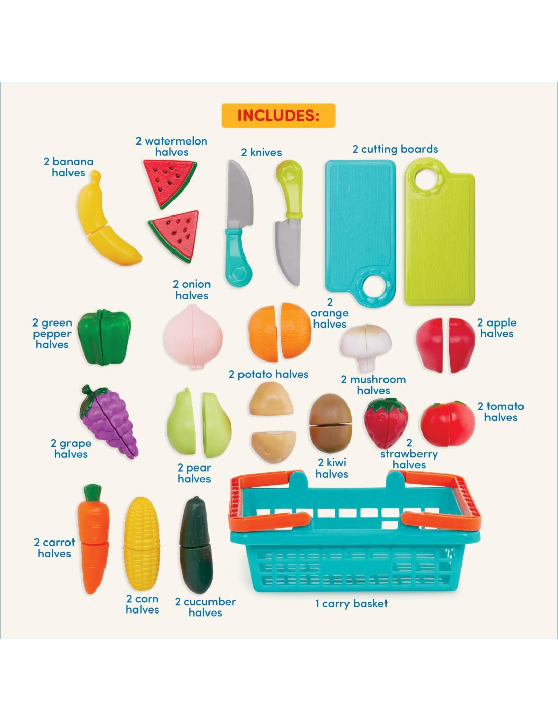 - SET DE COCINA PARA NIÑOS: Pretende comprar y preparar un festín casero imaginario con esta comida de juego para niños pequeños. Este set de cocina para niños de 37 piezas incluye 1 canasta de juguete, 2 tablas de cortar, 2 cuchillos de juguete y un montón de comida de juego.