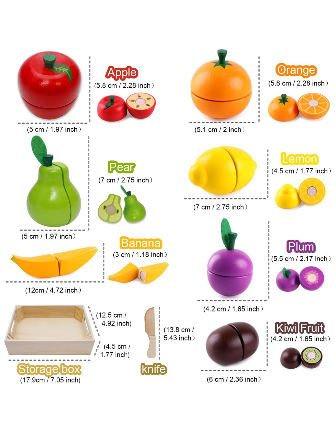 - Paquete Incluido: El conjunto de frutas y comida de juego de simulación de madera incluye una manzana, una naranja, una pera, un limón, un plátano, un kiwi, una ciruela, un cuchillo de madera y una caja de almacenamiento. No hay necesidad de preocuparse más por el desorden de los juguetes