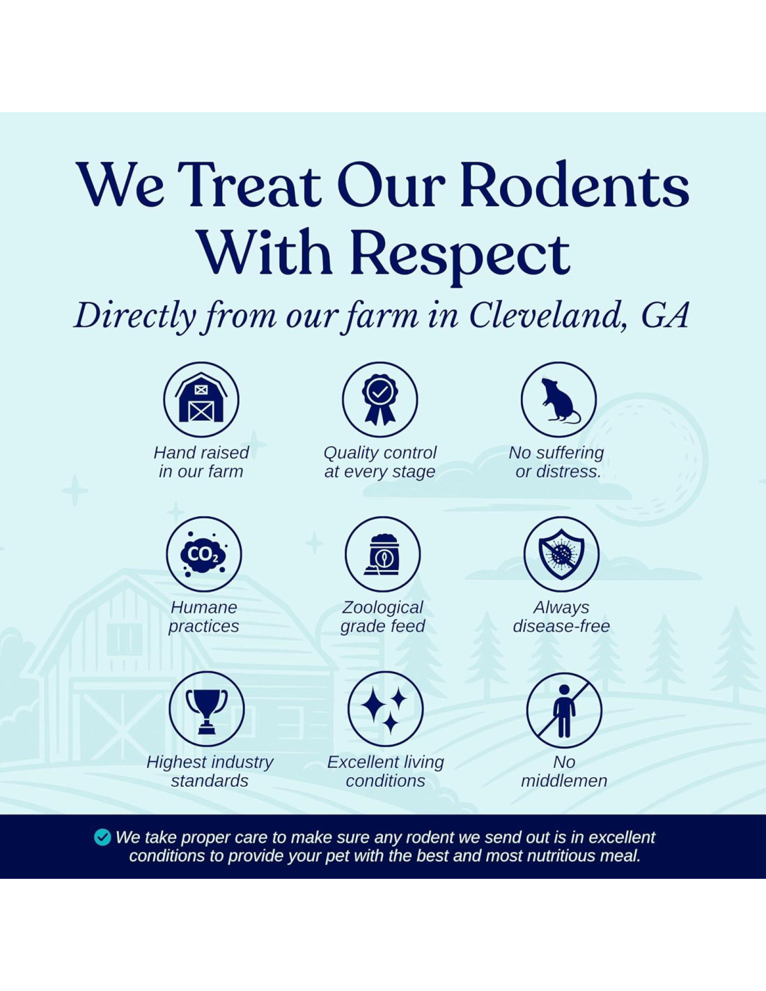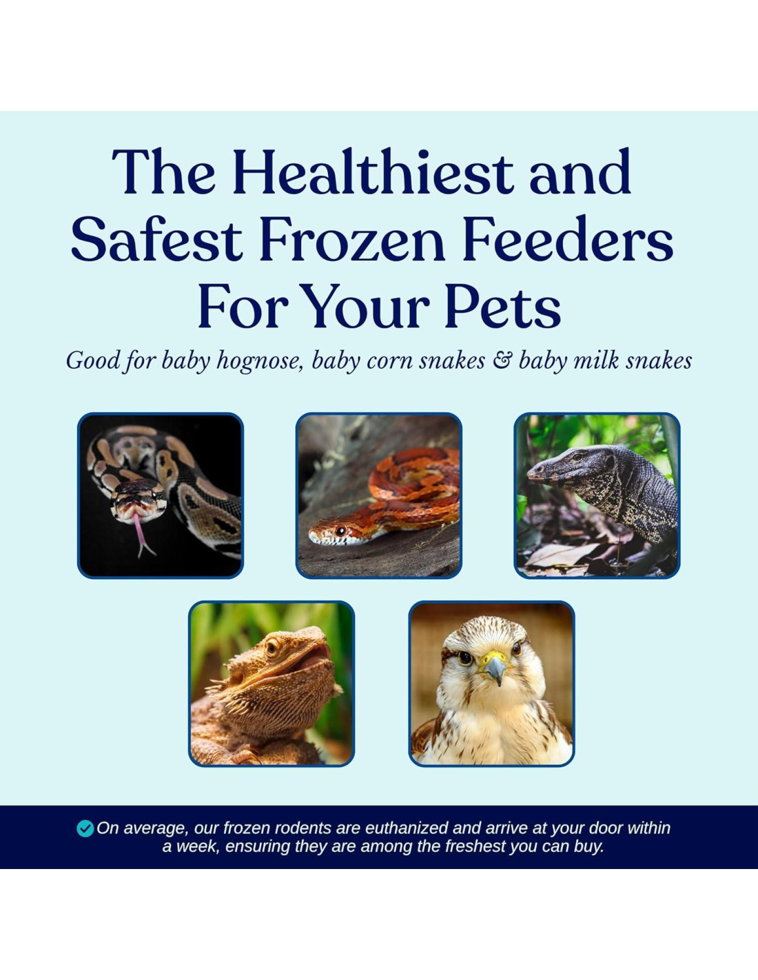 - Premium; todos nuestros roedores son alimentados con Mazuri, un alimento zoológico de calidad para ratones, para ayudar a asegurar que los ratones congelados sean lo más saludables posible para tu mascota; mejor aún, aseguramos que nuestro paquete de 75 ratones congelados pinkies siempre se críen bajo los más altos estándares y estén libres de enfermedades