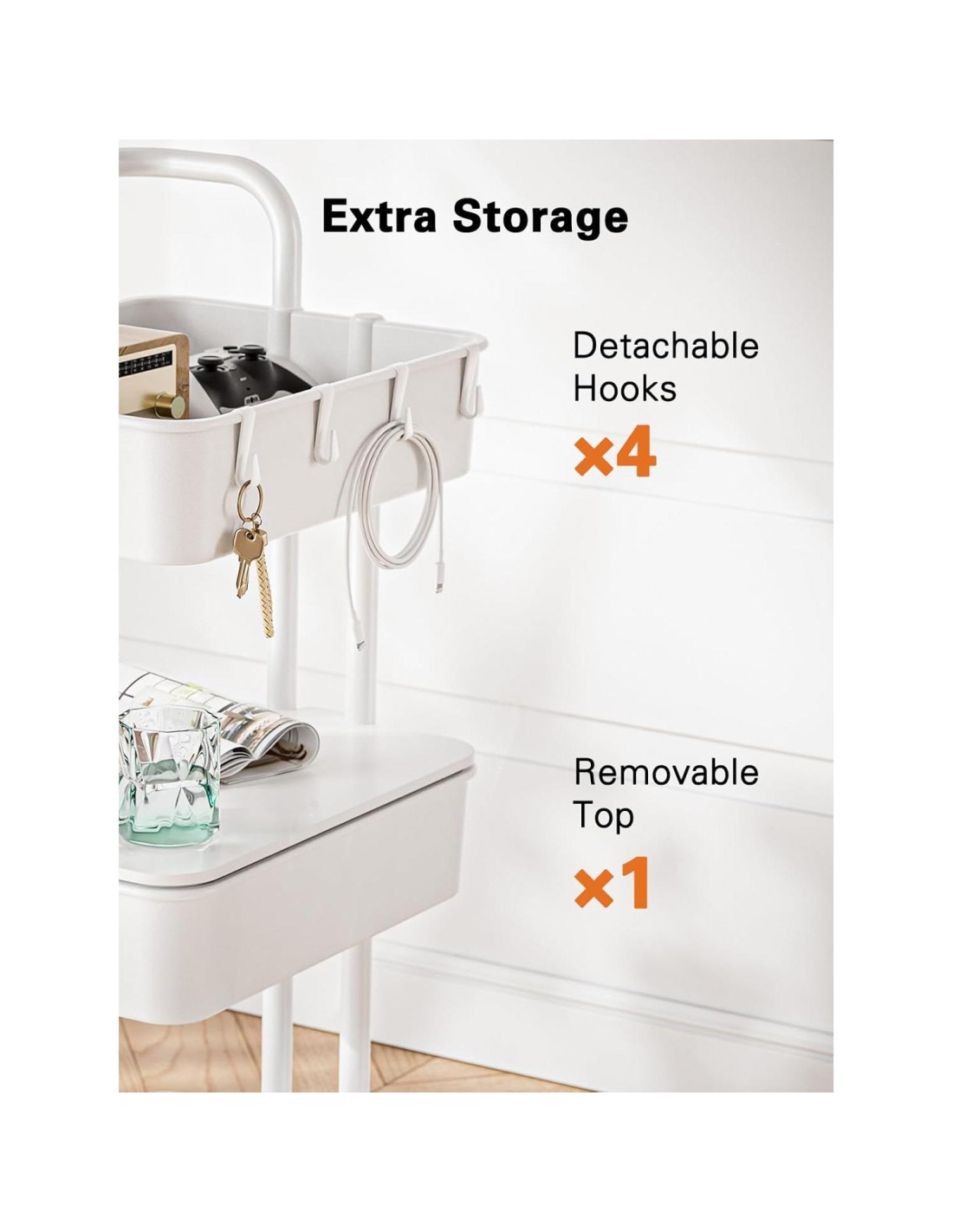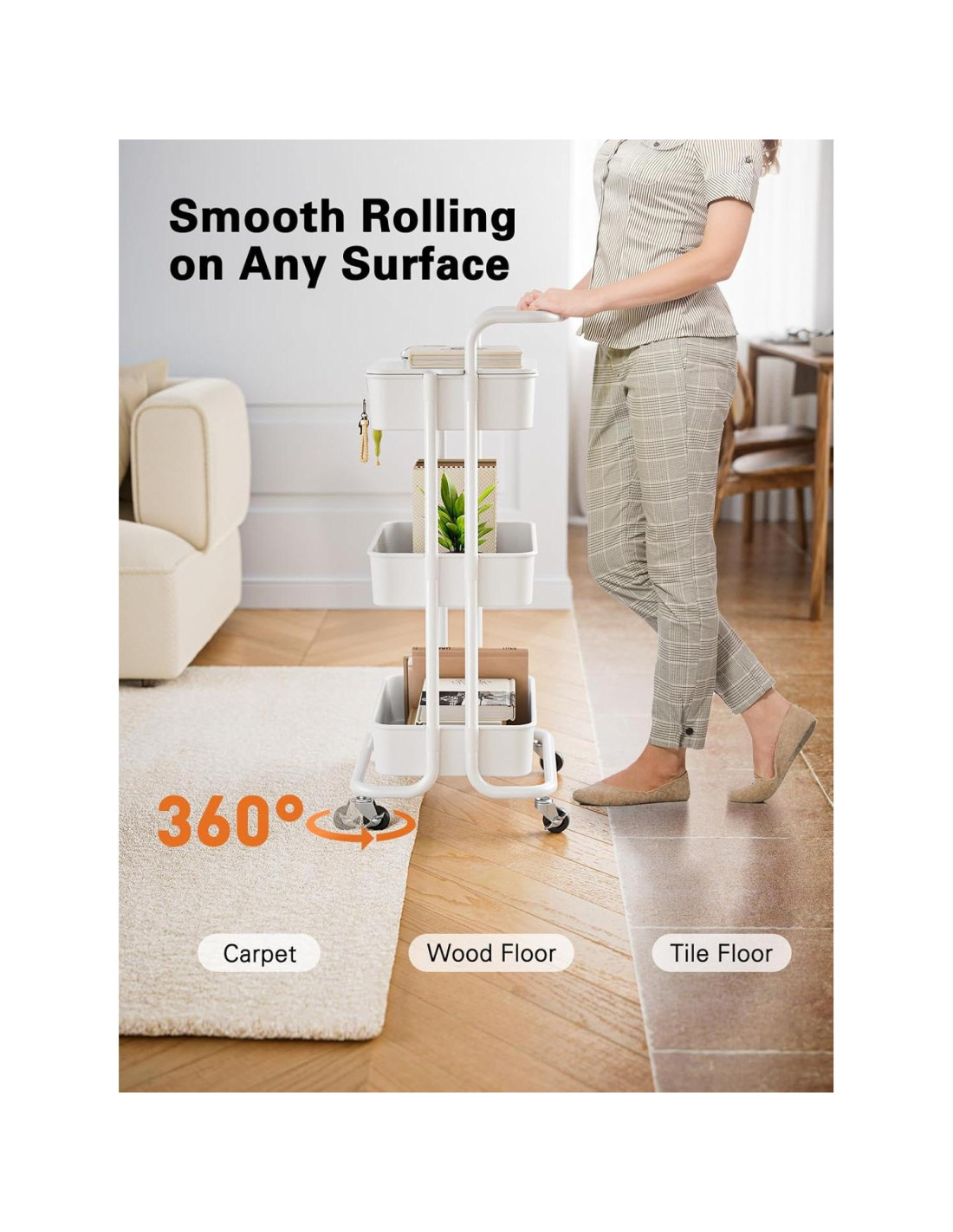 - Amplio Espacio de Almacenamiento: El carro rodante de 3 niveles con ruedas tiene tres grandes cestas de plástico PP (38.86 cm L x 29.46 cm W x 7.95 cm H) con 30.99 cm de espacio entre niveles para un fácil acceso a latas, libros u otros artículos almacenados. Cuatro ganchos proporcionan más almacenamiento para artículos más pequeños.