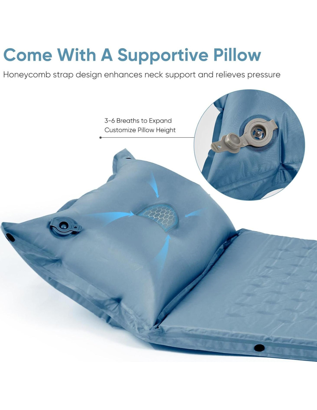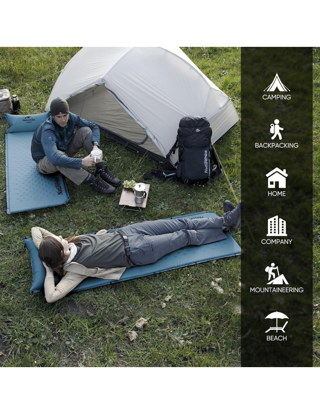 - [Inflado Rápido] Gira la boquilla para inflar la almohadilla al 70% automáticamente, luego da unos soplos para una almohadilla más completa. Para desinflar, aprieta el cojín de aire. Nota: La almohadilla está empaquetada al vacío profesionalmente, por lo que el primer inflado puede tardar hasta 20 minutos.