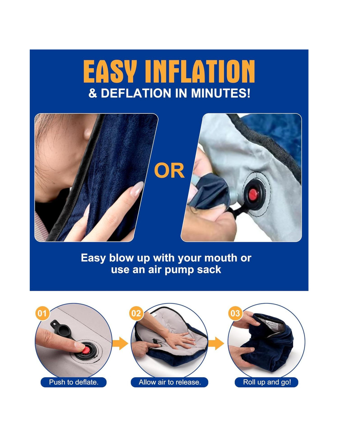 - INFLADO Y DESINFLADO RÁPIDO: ¡Simplemente infla la almohada con solo unas pocas respiraciones! Ajusta fácilmente la firmeza presionando el botón rojo, seleccionando más firme o más suave según tu preferencia. Cuando sea hora de empacar, la desinflación toma solo segundos, haciendo que el almacenamiento y el viaje sean muy fáciles