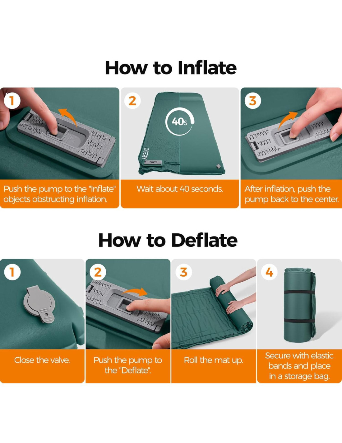 - INFLACIÓN Y DESFLACIÓN CON UN TOQUE. ¡Olvídate de la molestia de bombas adicionales o inflar manualmente! Nuestra almohadilla de dormir de camping con bomba de aire inteligente incorporada te permite inflar tu almohadilla automáticamente con un solo clic; solo mírala expandirse. La configuración es rápida, así que pasas menos tiempo preparándote y más tiempo disfrutando del aire libre.