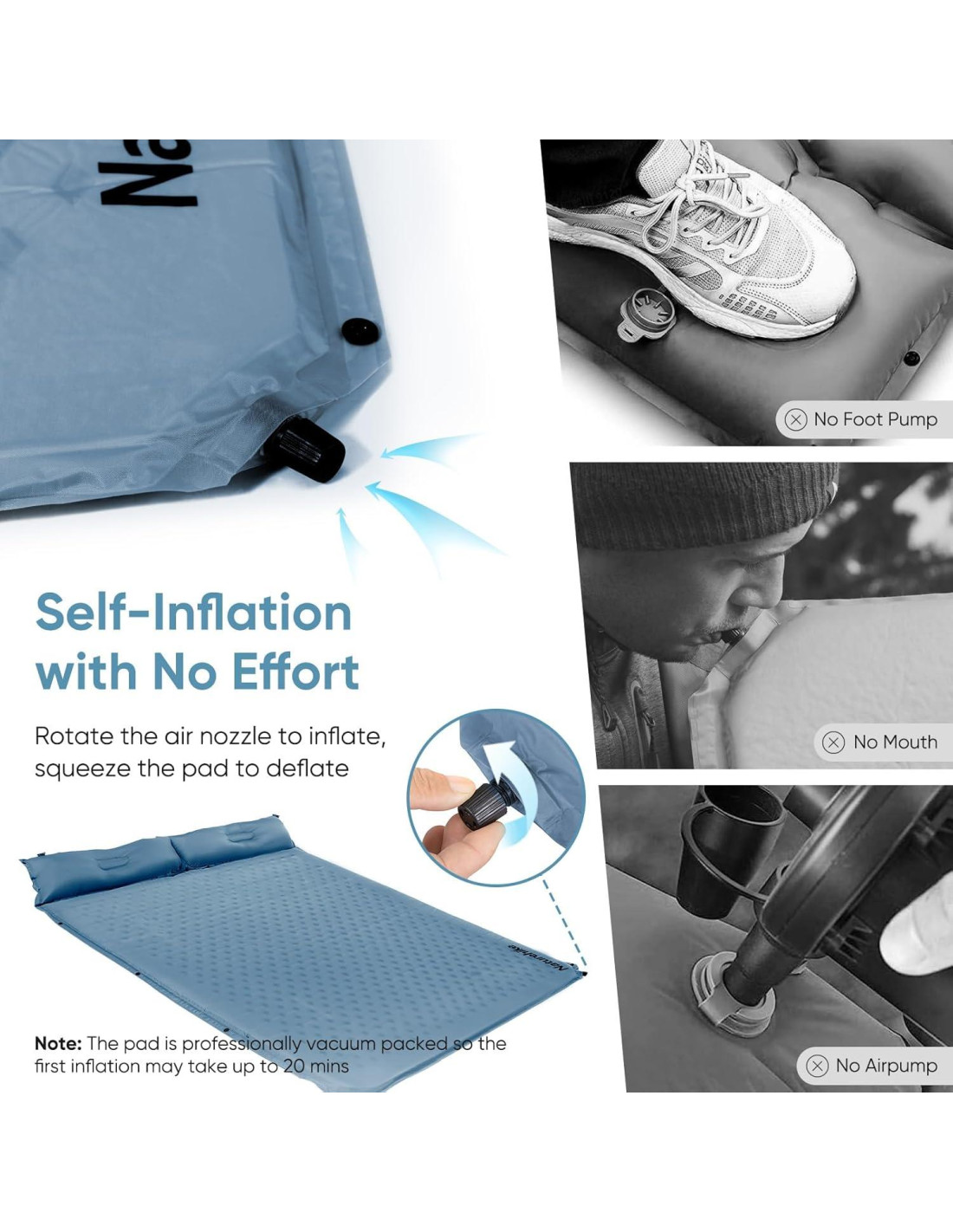 - [Inflado Rápido] Gira la boquilla para inflar la almohadilla al 70% automáticamente, luego da unos soplos para una almohadilla más llena. Para desinflar, aprieta el cojín de aire. Nota: La almohadilla está empaquetada al vacío profesionalmente, por lo que el primer inflado puede tardar hasta 20 minutos.