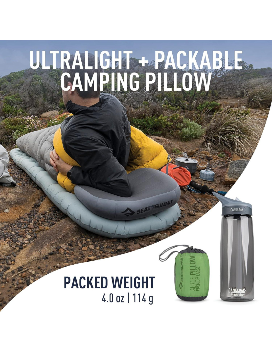 - El sistema de sueño Sea to Summit incluye una almohada premium Aeros y un forro de saco de dormir Breeze