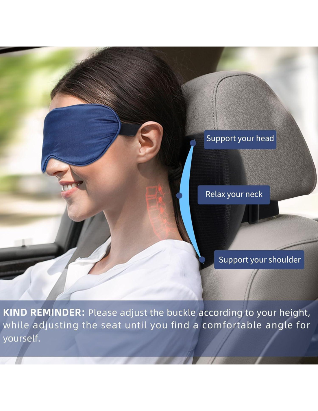 - Recibirás 2 almohadas de cabecera de coche con hebillas ajustables y 2 máscaras para los ojos para dormir en diferentes colores. Te pondrá en el copiloto cuando necesites un descanso. La almohada de coche y la máscara para los ojos serán una combinación perfecta, que traerá un gran alivio a tu fatiga de viaje. En el momento en que tu energía se restaure, te sentirás más feliz y relajado.