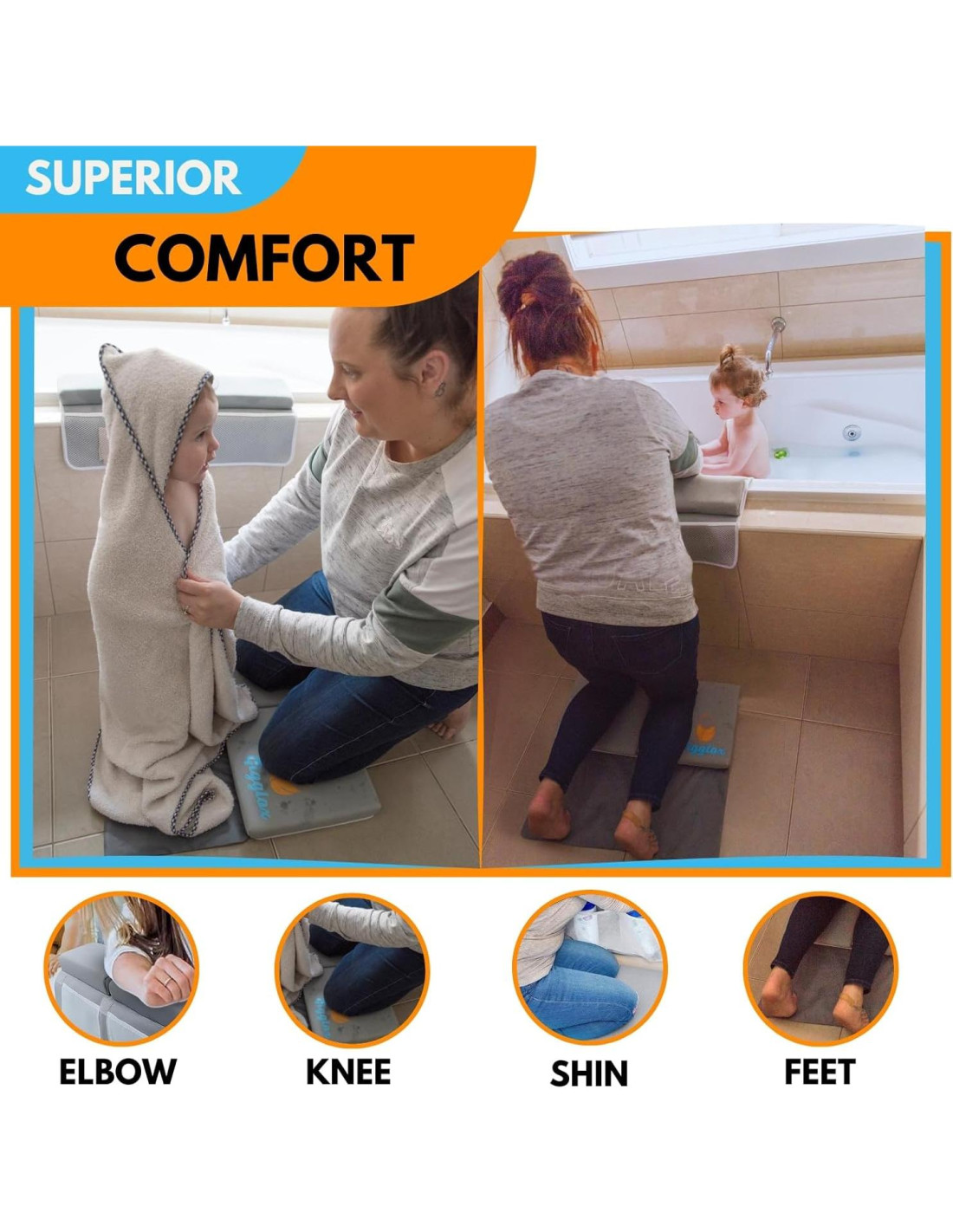 - HORA DE BAÑO CÓMODA PARA BEBÉS: Almohadilla para Rodillas de Baño y Juego de Descanso para Codos de 3.81 cm de grosor está hecha de espuma con memoria de calidad y viene con un Protector de Pies incorporado para evitar que sus pies toquen los azulejos del suelo mientras baña al bebé. Úselo para proteger los pies del bebé de la suciedad del suelo mientras los seca en lugar de usar toallas.
