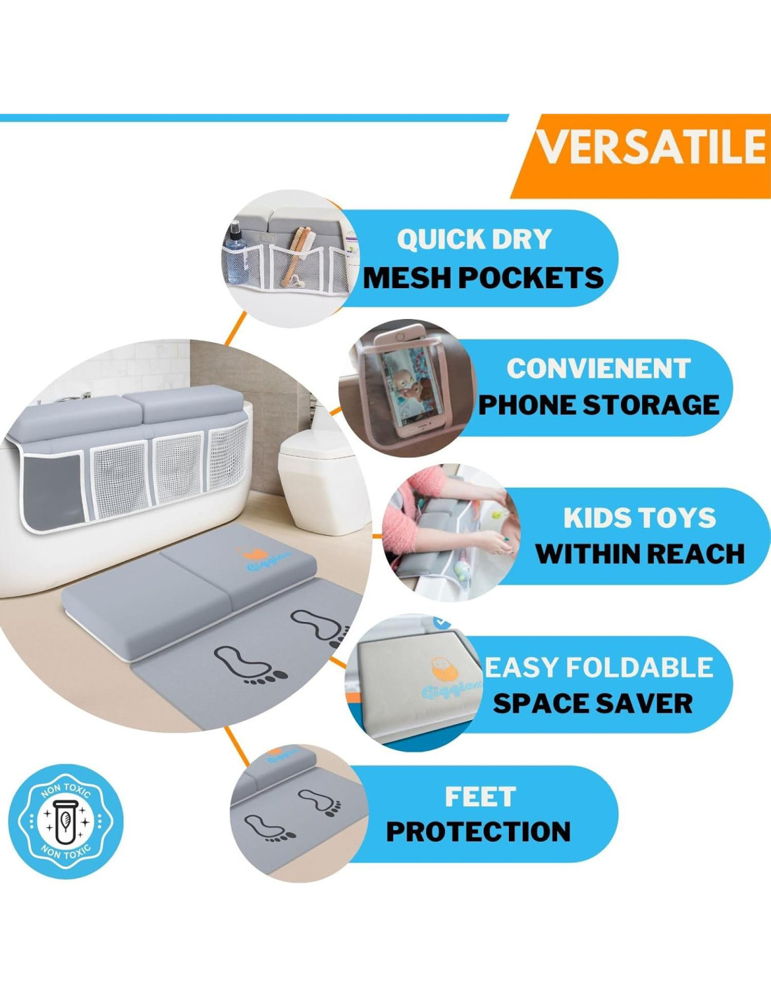 - AMPLIO ALMACENAMIENTO: La Almohadilla para Baño de Bebé está equipada con un organizador de juguetes para la bañera, bolsillos de malla incorporados para mantener suministros, juguetes, champú, jabón y cepillo para el cabello al alcance. Los bolsillos son transpirables, lo que permite un secado rápido para el uso diario.