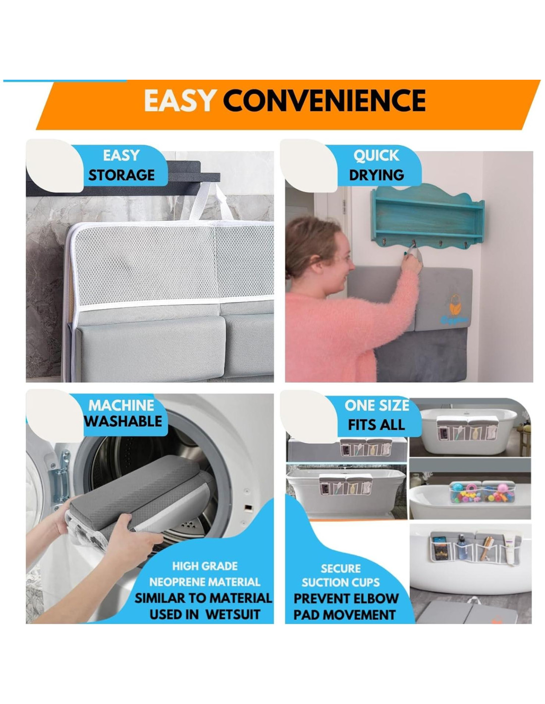 - ALMOHADILLA PARA CODO Y RODILLA DE BAÑO CÓMODA: Nuestra almohadilla para arrodillarse para bañar al bebé tiene una solución de almacenamiento fácil y puede guardarse convenientemente fuera de la bañera o en un gancho con los lazos de colgar incorporados, asegurando que su baño se vea organizado.