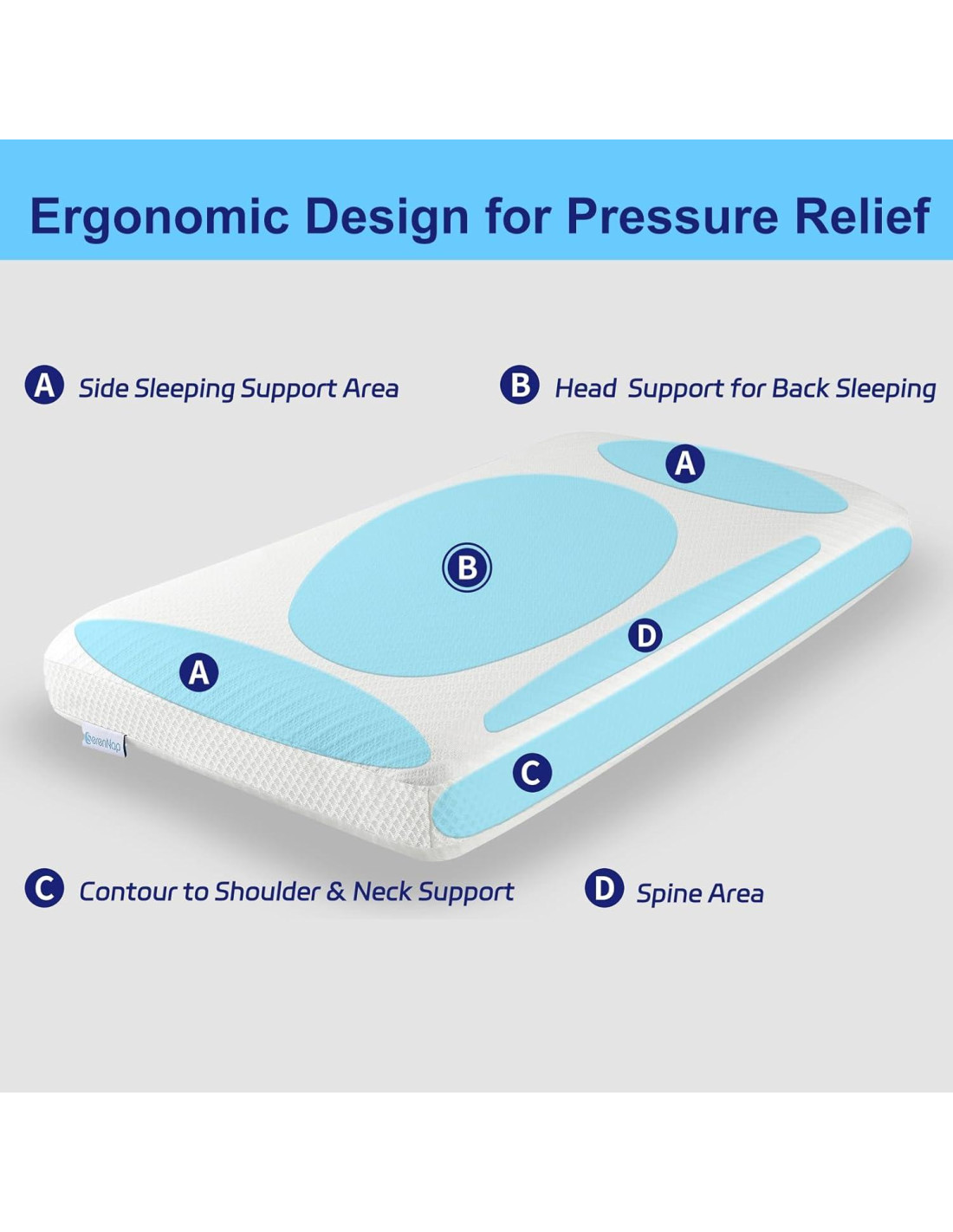 - Diseño Ergonómico: La curva de corte en forma de S especializada y el innovador diseño de contorno proporcionan un soporte perfecto para la columna cervical mientras mantienen la curva natural de su cuello. Las zonas de presión acunan suavemente su cuello y hombros, brindando un alivio efectivo del dolor en el cuello y hombros. Disfrute de un sueño profundo y restaurador cada noche y despierte sintiéndose recargado, renovado y listo para enfrentar el día