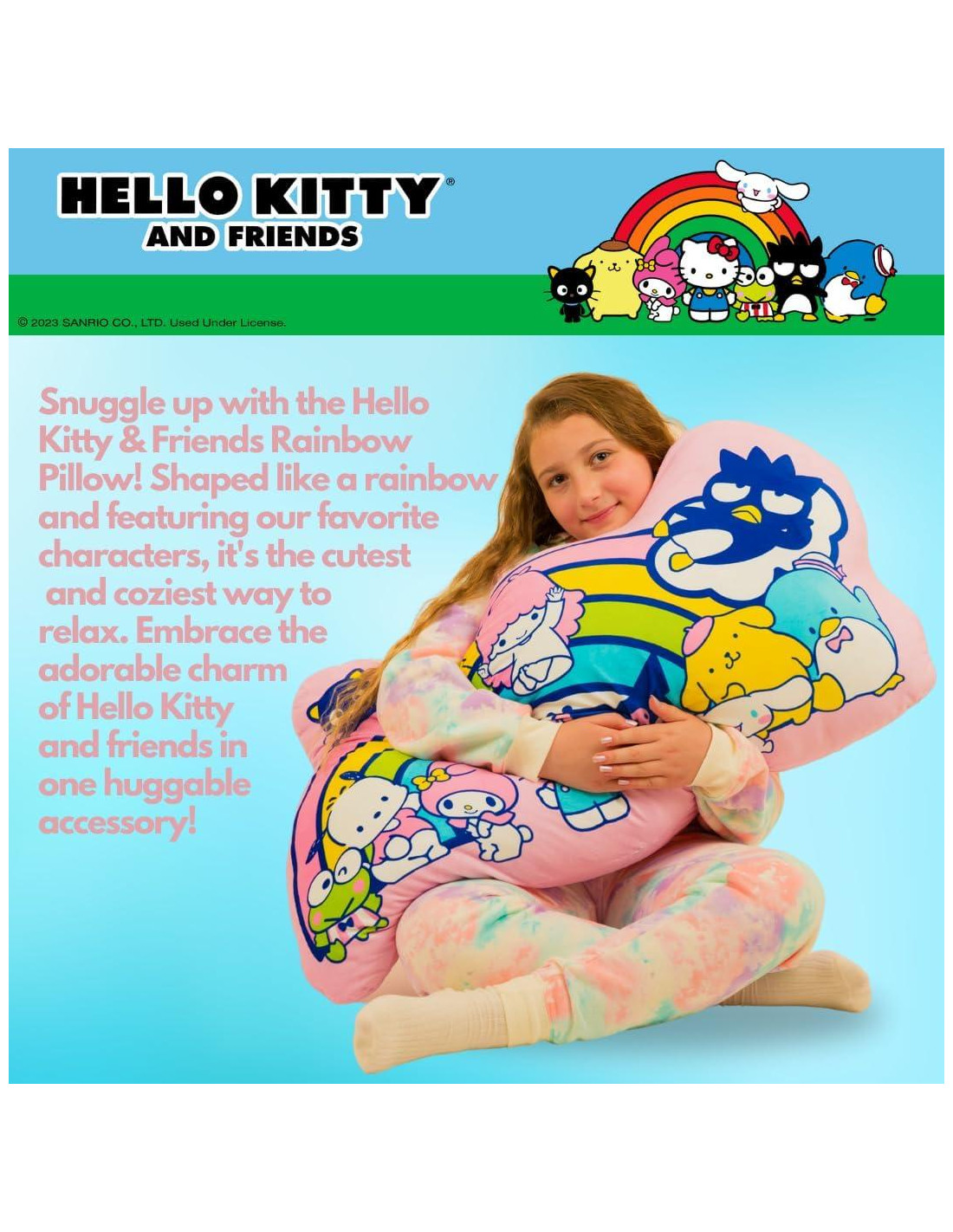 - DISEÑO DE HELLO KITTY Y AMIGOS: ¡Acurrúcate con la Almohada Arcoíris de Hello Kitty y Amigos! Con forma de arcoíris y presentando a nuestros personajes favoritos, es la forma más linda y acogedora de relajarse. ¡Abraza el encanto adorable de Hello Kitty y sus amigos en un accesorio abrazable!