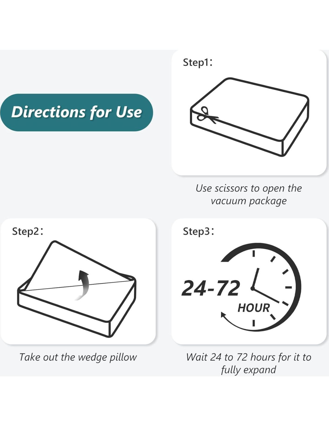 - Servicio postventa de alta calidad: Si encuentras algún problema al usar el juego de almohadas en cuña de 3PCS, podemos responderte dentro de 24 horas y proporcionar soluciones personalizadas. NOTA: Las almohadas en cuña Longering están empaquetadas al vacío para un transporte óptimo, se recomienda dejarlas desplegar durante 24-48 horas para que se expandan completamente a su forma original.