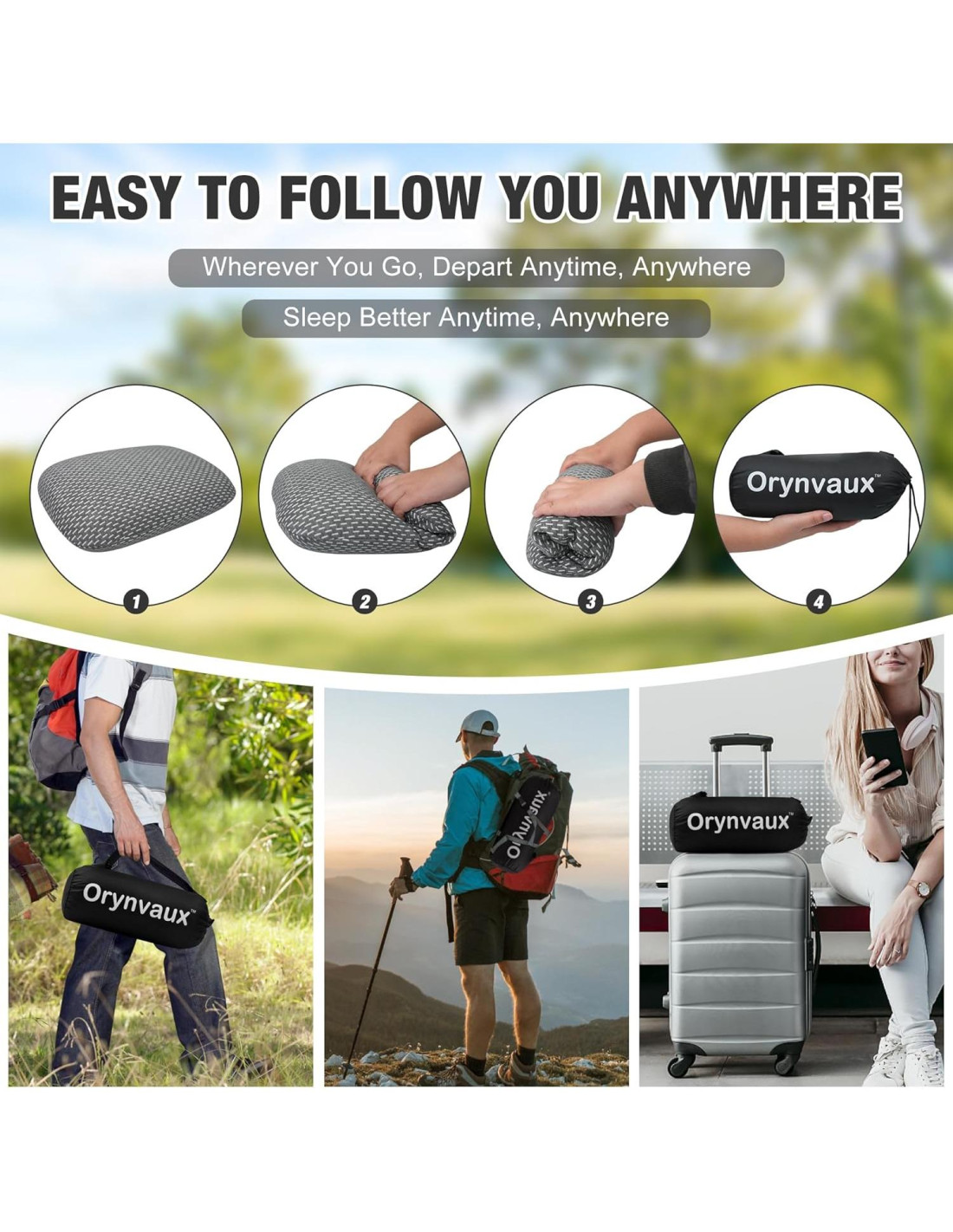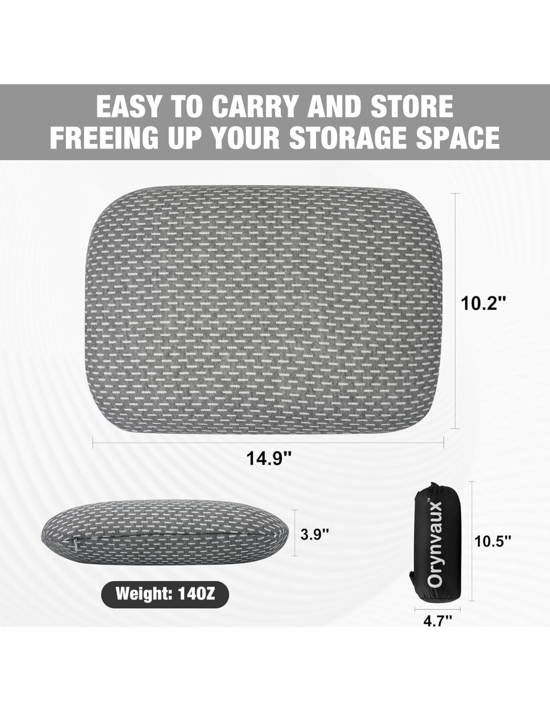 - Portabilidad Ultra-Compacta y Ligera - Incluye una bolsa de compresión de 10.6"x4.7" - reduce la almohada a 1/3 del tamaño original (15"x10"x4"). Pesa solo 396 gramos - diseño ligero que se adapta sin esfuerzo en mochilas, maletas o maleteros de automóviles para camping, vuelos o desplazamientos diarios.