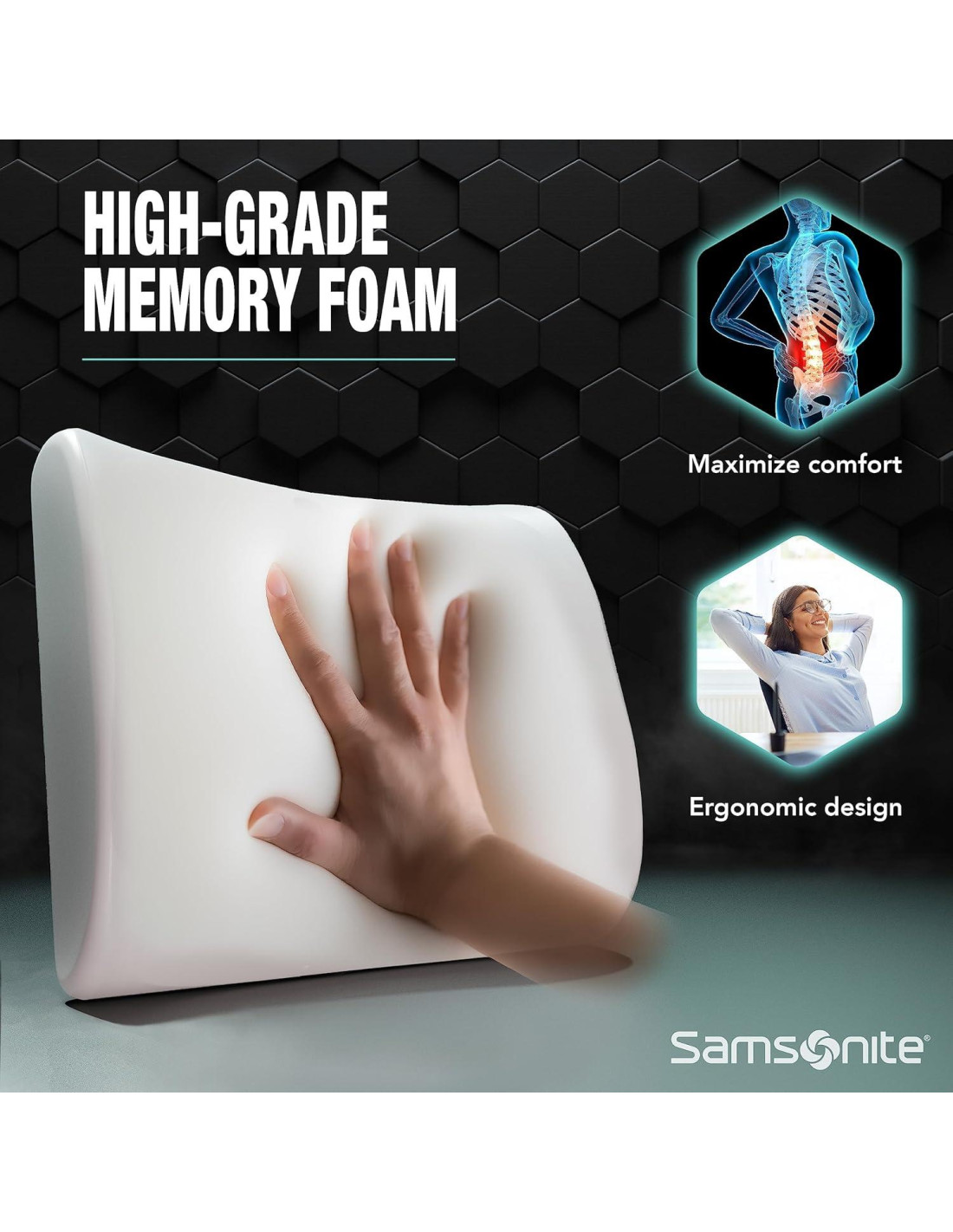Comodidad superior A diferencia de algunas almohadas que se aplanan con el tiempo, el cojín de soporte lumbar de Samsonite permanecerá y nunca se aplanará gracias a su estructura de espuma de memoria de alta densidad. Al adjuntarlo a la silla elegida, estás proporcionando soporte adicional a la parte baja de tu espalda para ayudar a aliviar cualquier incomodidad. Las horas pasadas sentado en un escritorio pueden afectar negativamente nuestra postura, por lo que al usar el cojín de soporte estás creando una experiencia ergonómica que proporcionará comodidad al adaptarse a la forma de tu espalda. Súper fácil de usar Midiendo 13.5 inches x 14 inches x 4.5 inches (34,29 cm x 35,56 cm x 11,43 cm), el cojín de soporte lumbar cuenta con una correa ajustable integrada que permite un ajuste fácil y seguro a la mayoría de las sillas, incluyendo sillas de oficina giratorias, asientos de coche, asientos de camión, sillas de comedor, asientos de avión y más, así como sillas de ruedas. La conveniente hebilla deslizante posicionada en la correa se puede ajustar fácilmente para lograr el ajuste perfecto. Solo toma un momento preparar tu cojín para una experiencia de asiento más cómoda. COMPRA AHORA y apoya tu parte baja de la espalda durante todo el día con la almohada de soporte lumbar de Samsonite