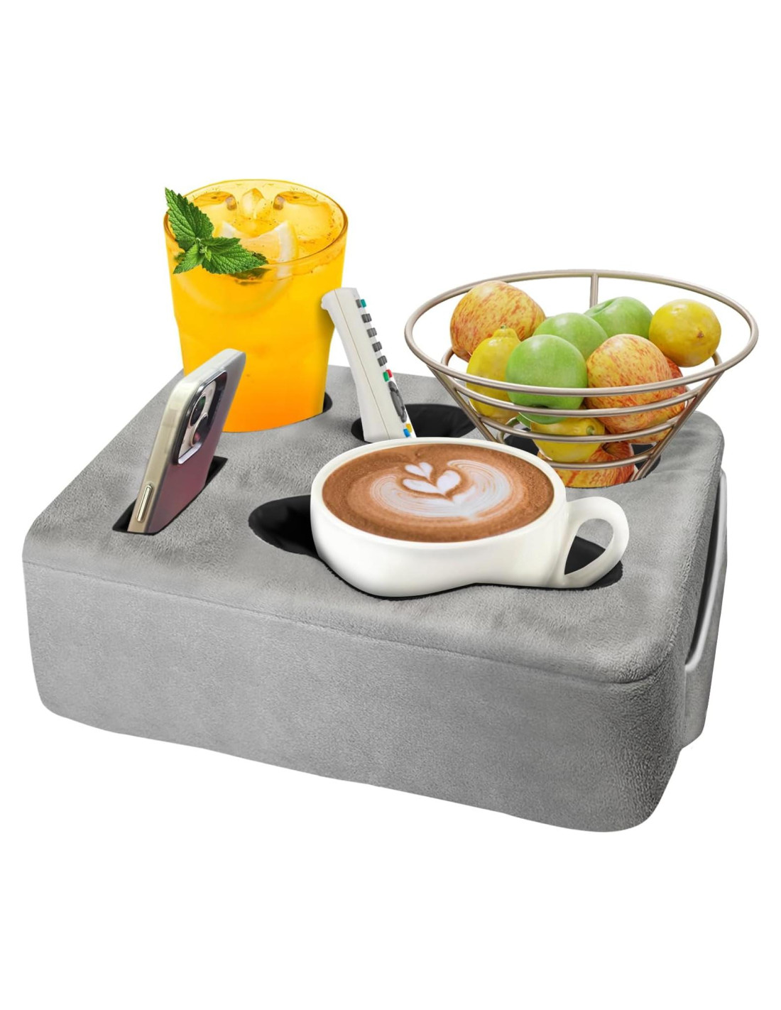 - Diseño de tamaño perfecto: El versátil cojín con soporte para bebidas de cama mide (13.8 x 10 x 3.1 pulgadas) (35,05 x 25,4 x 7,87 cm) y cuenta con 5 agujeros de almacenamiento de diferentes tamaños y un bolsillo lateral. El práctico soporte para bebidas del sofá tiene un aspecto elegante y también es una opción de regalo perfecta para vacaciones y ocasiones especiales. Consejos: Por favor verifica si el tamaño de tu taza coincide con el agujero del soporte para bebidas antes de comprar.