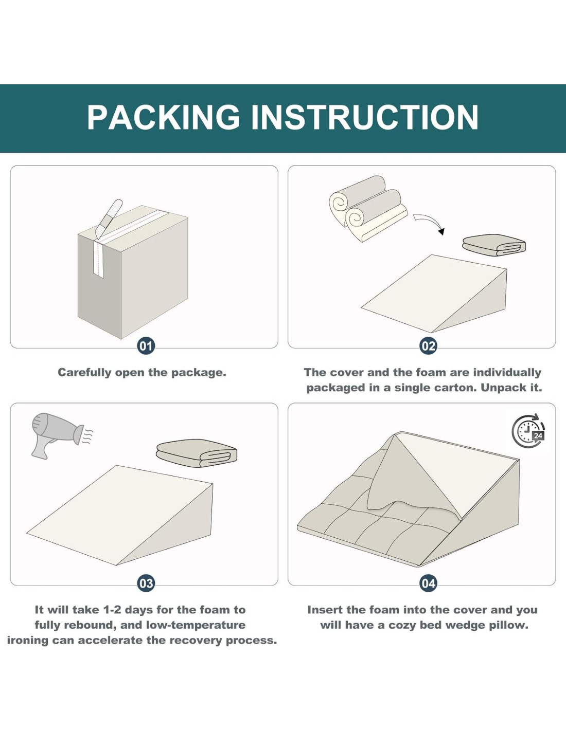 - Empaque: Nuestra almohada en cuña de espuma se comprime en bolsas al vacío para su empaque. La funda superior y el acolchado de espuma se empacan por separado en el mismo paquete. Una vez desempacada, el acolchado de espuma puede parecer muy plano. Por favor, utiliza un vaporizador de baja temperatura o un secador de pelo para acelerar el proceso de esponjamiento. Permite de 24 a 48 horas para que la almohada se esponje completamente. Inserta la espuma en la funda y tendrás una acogedora almohada en cuña.
