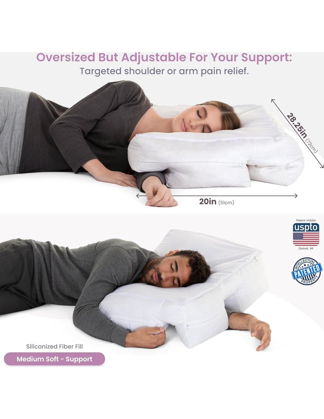 - Presenta un túnel para brazos único que estabiliza el brazo y reduce la presión en la articulación del hombro. Este diseño único mejora la circulación y ayuda a reducir el entumecimiento, la rigidez y la compresión nerviosa mientras duerme de lado.