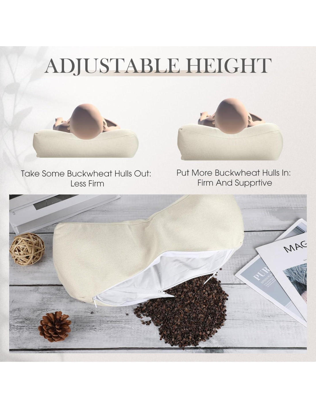 - Comodidad y Soporte Celestial: disfrute de la increíble comodidad y soporte que nuestras almohadas de trigo sarraceno delicadamente diseñadas ofrecen; Meticulosamente moldeadas con un diseño terapéutico, utilizan material de algodón y lino beige relleno con cáscaras de trigo sarraceno orgánico para adaptarse a su cabeza y cuello