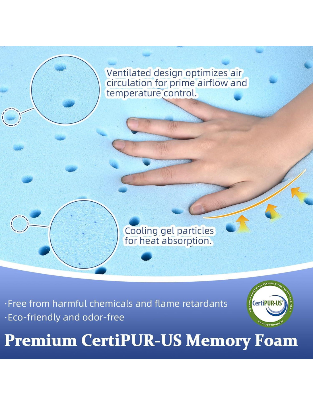 - Características Avanzadas de Refrigeración: Nuestra espuma está infundida con gel para absorber y disipar el calor lejos de la superficie de sueño. Los agujeros transpirables en nuestra espuma permiten la máxima circulación de aire, mejorando la comodidad. Cuando se asiste con la funda de tela de punto refrigerante, extiende la sensación de frescura durante toda la noche.