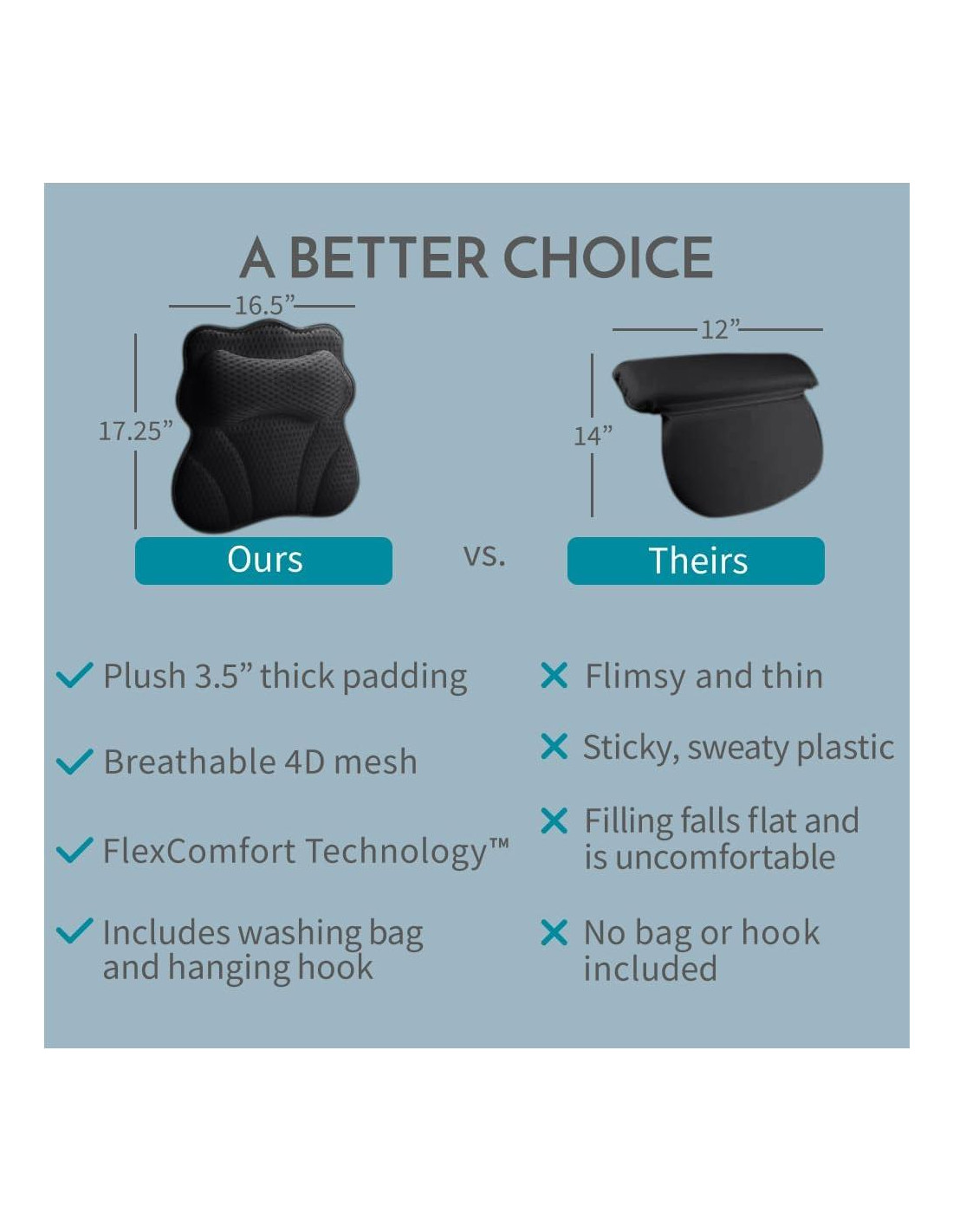 - DISEÑO GRUESO E INNOVADOR CON TECNOLOGÍA FLEXCOMFORT: almohada de baño extra gruesa y de soporte diseñada con nuestra única Tecnología FlexComfort; relleno acolchado de 3.5 pulgadas (8.89 cm) de grosor se adapta a la forma de tu cuerpo para máxima comodidad