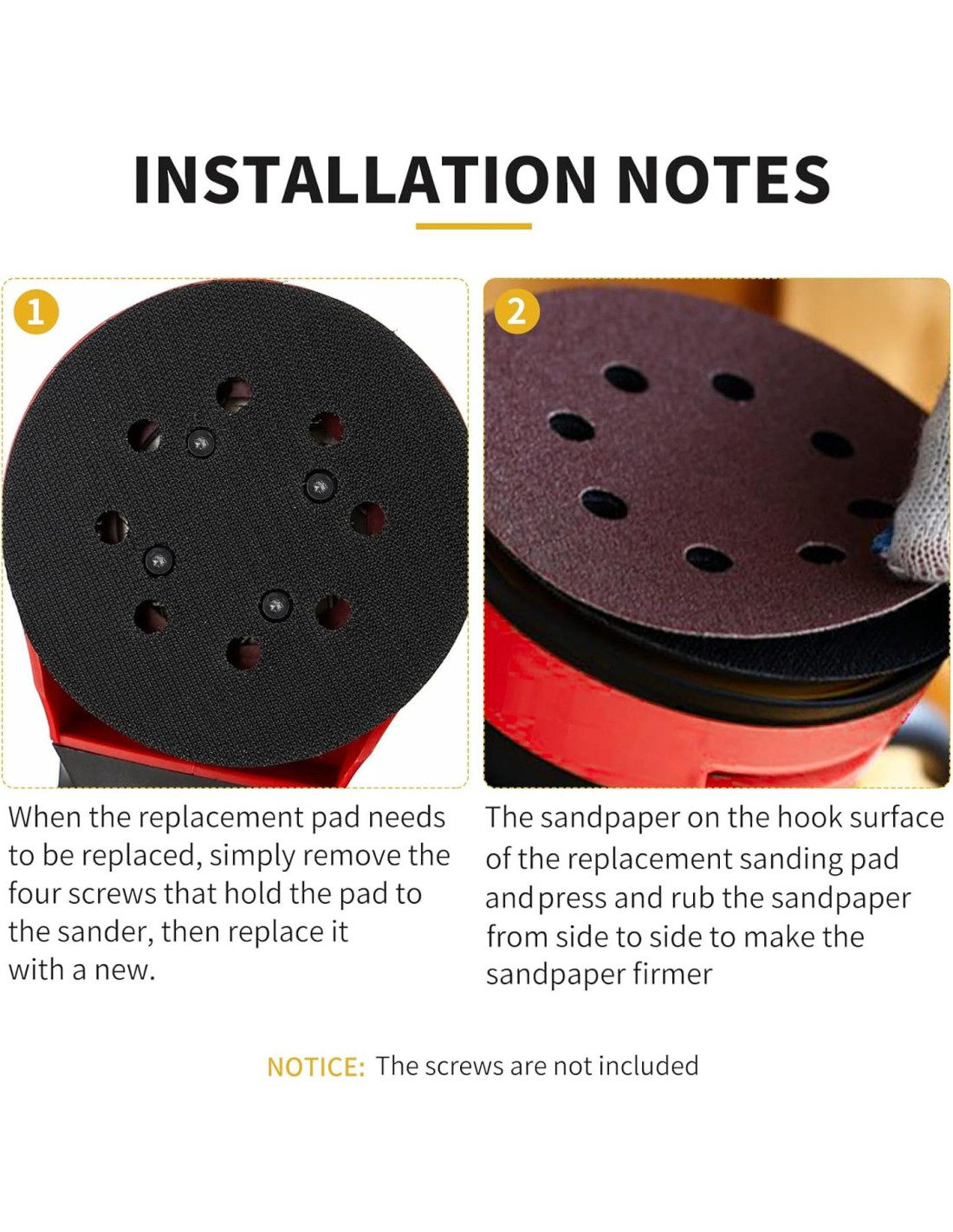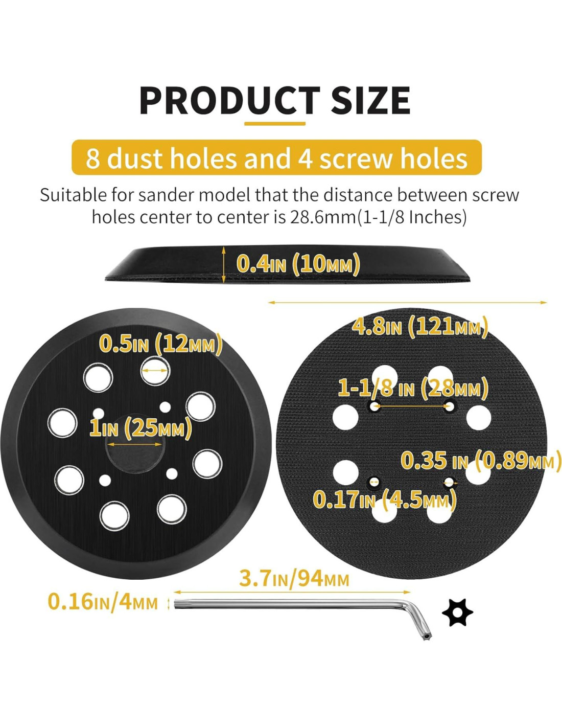 - [Tamaño de Especificación] Almohadilla de Lijadora de 5" con Ganchos y Bucles tiene 4 agujeros para tornillos y 8 agujeros para polvo, el diámetro del agujero redondo central es de 1 pulgada (26 mm), la distancia de centro a centro de los agujeros de tornillo adyacentes es de 1-1/8 Pulgadas (28.5 mm), por favor confirme el tamaño de la máquina antes de la compra