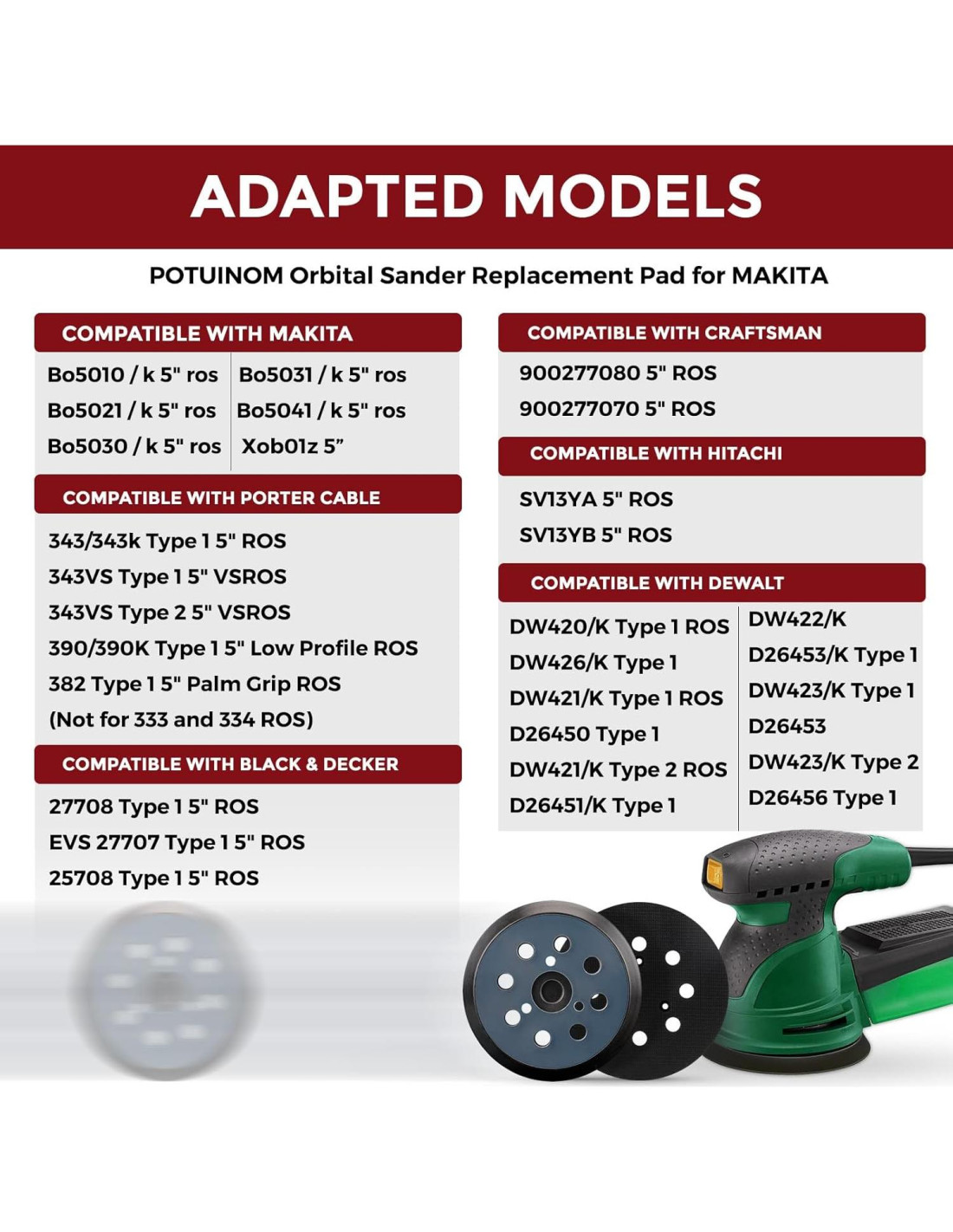 - Modelos compatibles: almohadillas de lijadora compatibles con Makita BO5010/K 5" ROS, BO5031/K 5" ROS, BO5021/K 5" ROS, BO5041/K 5" ROS, BO5030/K 5" ROS, XOB01Z 5" ROS. Almohadillas de lijadora para Dewalt DW420/K Tipo 1 ROS, DW426/K Tipo 1, DW421/K Tipo 1 ROS, D26450 Tipo 1, DW421/K Tipo 2 ROS, D26451/K Tipo 1, etc.