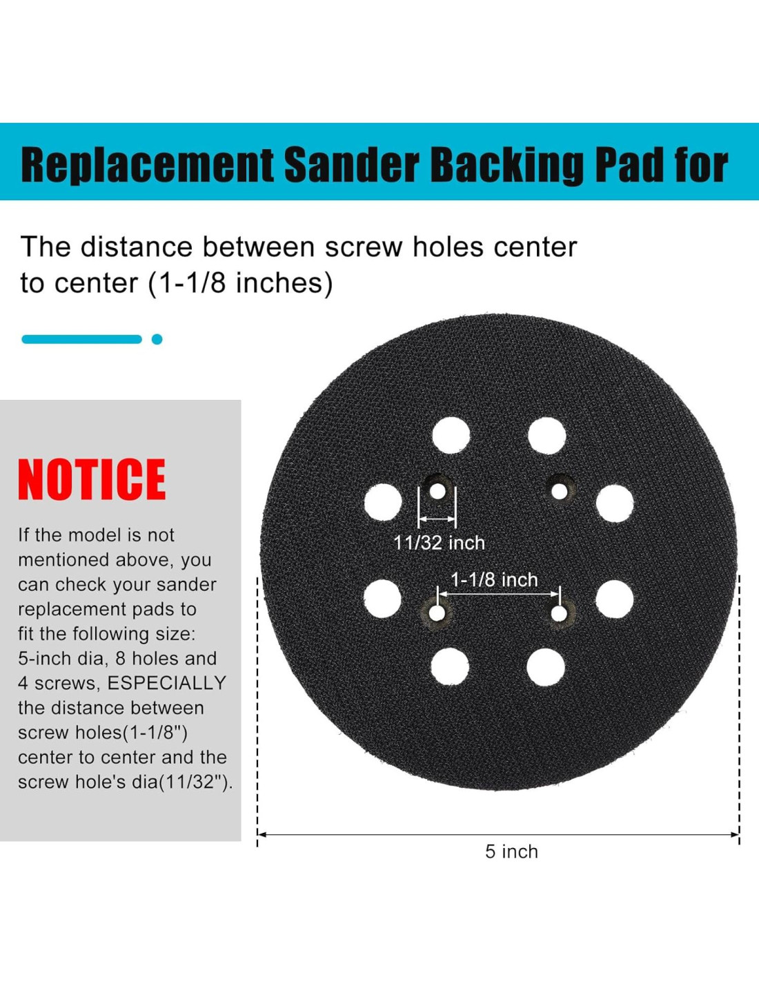 - Almohadilla de reemplazo universal: la almohadilla de reemplazo de 5 pulgadas con gancho y bucle se caracteriza por 4 agujeros para tornillos y 8 agujeros para polvo, se adapta a la mayoría de las almohadillas de respaldo de lijadora, la distancia entre el centro de los agujeros para tornillos de la almohadilla es de aproximadamente 1-1/8 pulgadas (2,86 cm), por favor confirme el tamaño antes de comprar