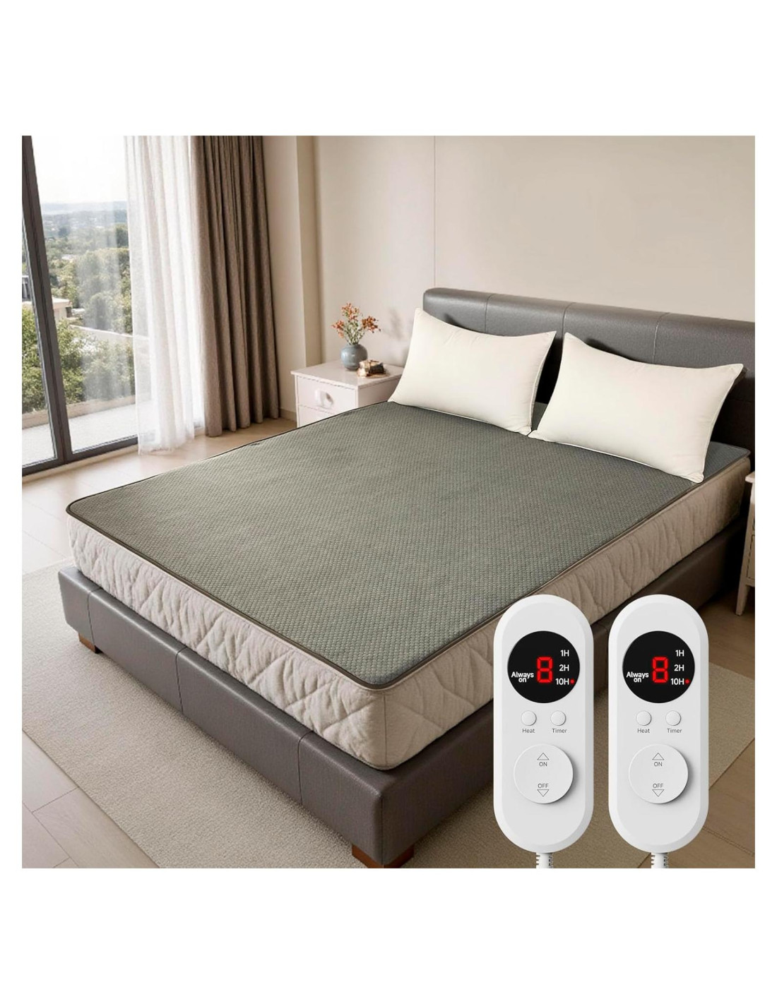 Mantén el frío a raya con nuestra Almohadilla Térmica para Colchón - tu compañero definitivo para noches cálidas y cómodas durante toda la temporada. ¿La almohadilla térmica calienta de manera uniforme y se mantiene cómoda? Sí. La almohadilla eléctrica utiliza un diseño de cable de calefacción de múltiples zonas para ofrecer calor constante en toda la superficie. Se mantiene flexible y suave, no rígida ni grumosa. Simplemente despliégala completamente y disfruta de un calor uniforme sin puntos fríos toda la noche. ¿Cuántos niveles de calor y opciones de temporizador tiene? Esta almohadilla eléctrica ofrece 8 niveles de calefacción ajustables y un temporizador de apagado automático de 1/2/10 horas. Puedes elegir fácilmente tu temperatura y duración de calefacción preferidas para mayor comodidad y eficiencia energética. ¿Cuánto mide el cable de alimentación? El cable de alimentación mide aproximadamente 2.74 metros (9 pies) de largo en total, combinando el cable de alimentación principal y el cable del controlador. Esto te da flexibilidad para alcanzar los enchufes cerca de tu cama o sofá sin restricciones. ¿Cuáles son los estándares de voltaje, frecuencia y seguridad? Está clasificada para uso doméstico en EE. UU. a 120V / 60Hz y certificada por ETL para seguridad. Asegúrate de que tu enchufe cumpla con estas especificaciones antes de enchufar para un funcionamiento seguro y confiable. La manta eléctrica no calienta - ¿qué debo hacer? Verifica que el enchufe esté firmemente conectado y que el enchufe de alimentación esté funcionando. Asegúrate de que el controlador esté correctamente conectado al puerto de la manta. Un orden de conexión incorrecto puede hacer que no caliente. Despliega completamente antes de usar.