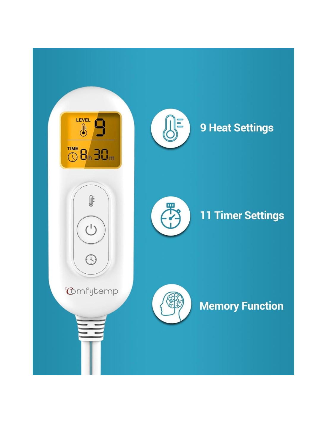 - 9 Configuraciones de Calor y Función de Luz de Fondo: Nuestra almohadilla térmica para la parte baja de la espalda Comfytemp ofrece 9 configuraciones de calor, permitiéndote personalizar la temperatura deseada para aliviar la fatiga, la rigidez muscular y los calambres menstruales, o mantenerte caliente a medida que el frío se acerca. Y la función de memoria podría ayudarte a recordar tu temperatura favorita. Además, la pantalla iluminada hace que sea conveniente para su uso nocturno.