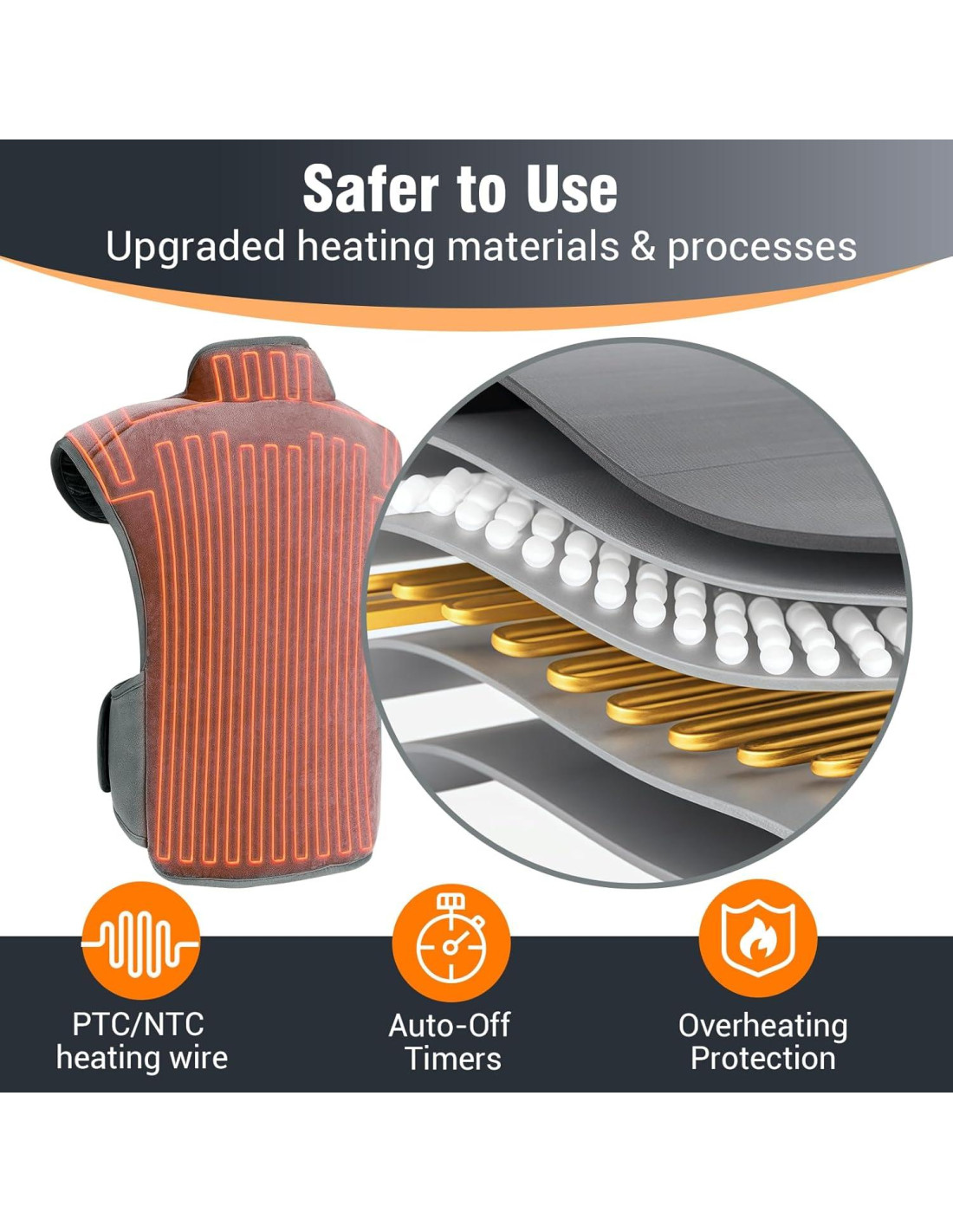 - Diseño para la parte superior de la espalda: Hemos encontrado que muchas personas prefieren usar almohadillas térmicas portátiles mientras están sentadas. Así que nuestra almohadilla térmica eléctrica presenta un diseño único para la parte superior de la espalda. A diferencia de las bolsas de calor tradicionales para hombros y cuello que son demasiado largas, nuestras almohadillas térmicas miden aproximadamente 22 pulgadas (56 cm) desde el collar hasta la espalda. Esto asegura que los extremos de la almohadilla térmica no se enrollen al sentarse, manteniendo la parte superior de la espalda ajustada y evitando que el cable de calefacción se doble y cause un peligro.