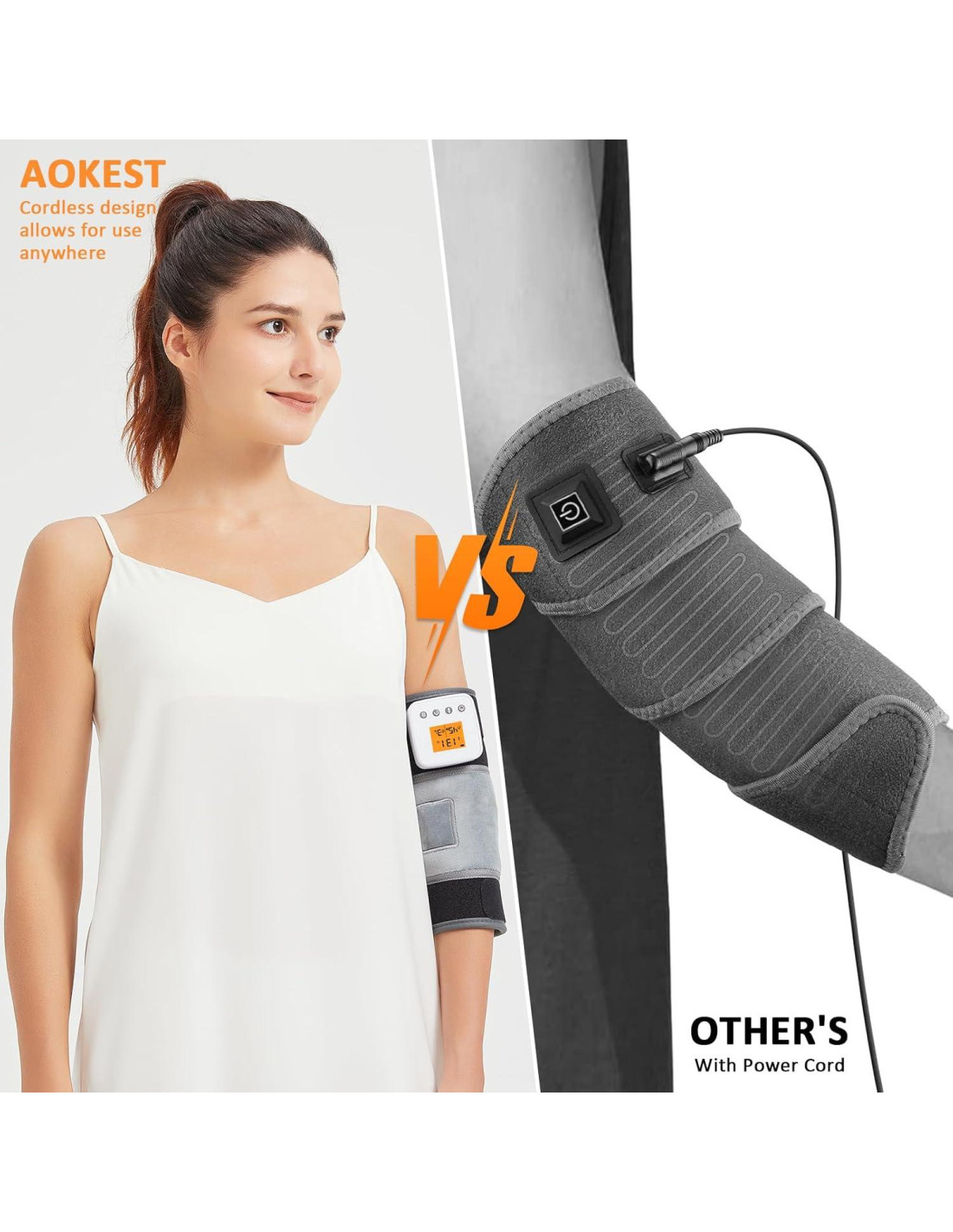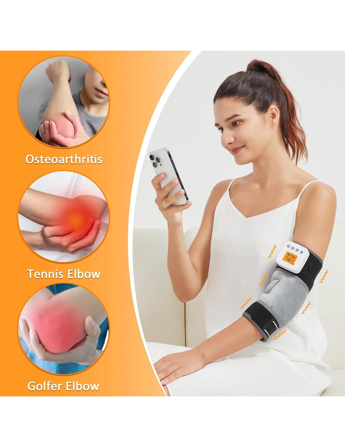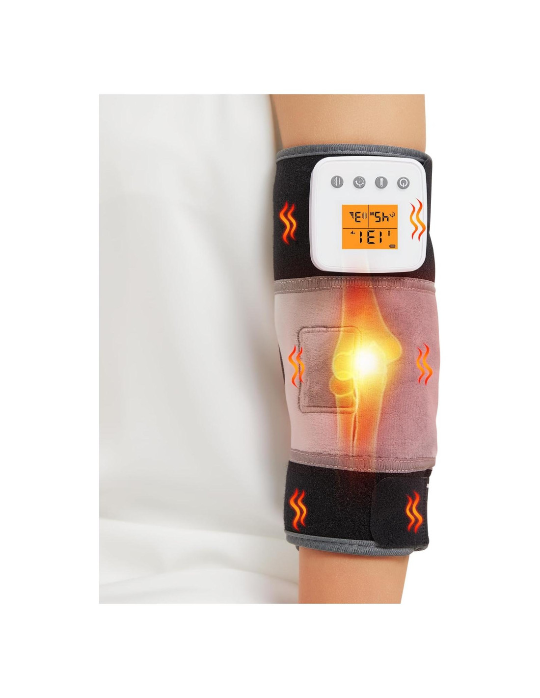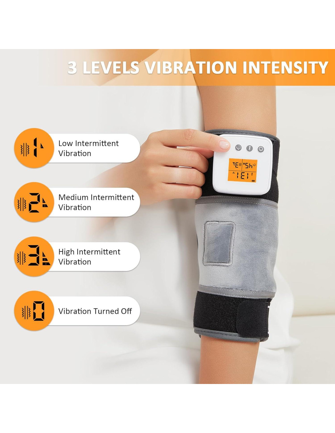 - 3 Ajustes de Temperatura: La almohadilla térmica de masaje vibratorio para el brazo tiene 3 ajustes de temperatura, baja temperatura: 45C (113F), temperatura media: 55C (131F), alta temperatura: 65C (149F). La almohadilla térmica inalámbrica para codo personaliza su comodidad con tres niveles de calor, proporcionando el calor perfecto para aliviar la incomodidad y mejorar la circulación sanguínea. Nota: Antes del primer uso, cargue completamente el dispositivo. Después de cada sesión de uso, asegúrese de quitar el controlador para extender la vida útil de la batería. La vibración y la calefacción son botones separados y deben encenderse por separado.