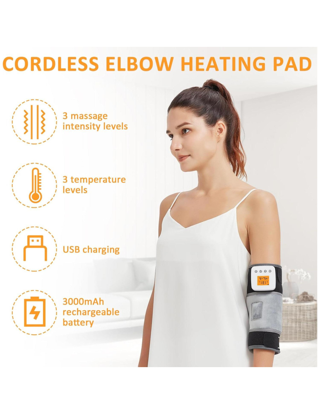 - 3 Modos de Masaje Vibratorio: La almohadilla térmica para codo inalámbrica utiliza 2 motores para ayudarle a aliviar el dolor y promover la relajación en el codo y áreas circundantes. La envoltura térmica para codo con masaje vibratorio de 3 velocidades baja, media y alta puede aliviar efectivamente la tensión muscular y mejorar la rigidez articular. Nota: Mantenga presionado durante más de 4 segundos para encenderlo. Si el cable de carga y el adaptador son inferiores a 5V 2A, la batería no se cargará. Se recomienda usar un cable de carga de 5V 2A. La batería tiene protección de carga. El cable de datos tipo C para Apple puede no cargar. Se recomienda usar el cable de datos tipo C de Android.