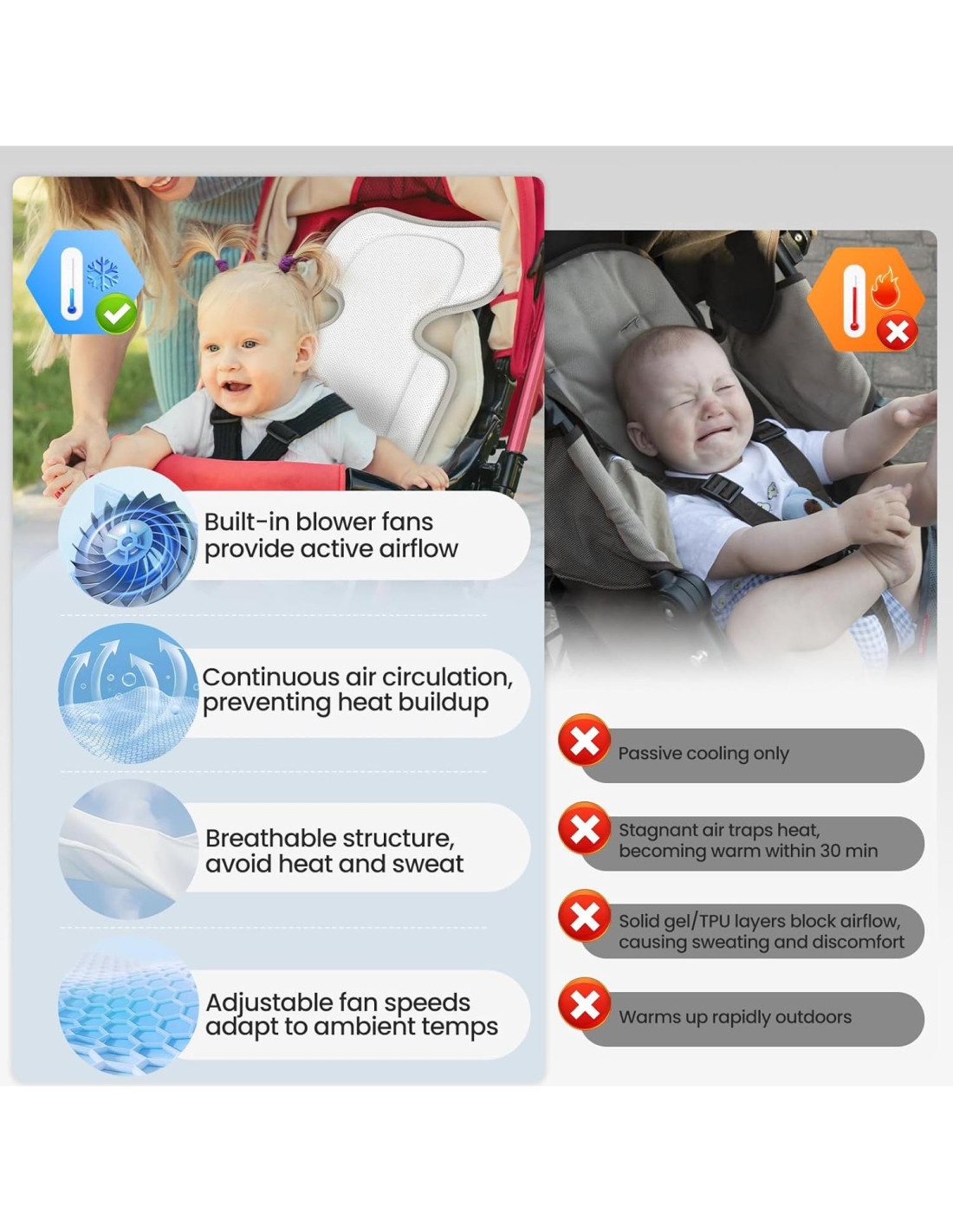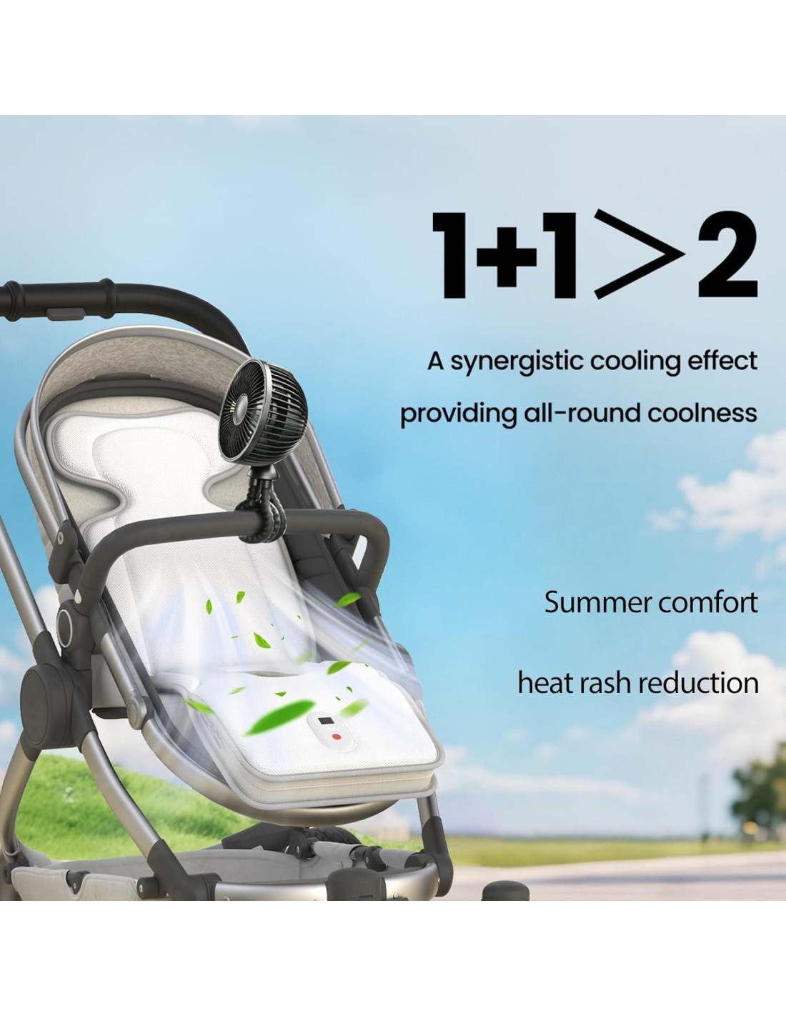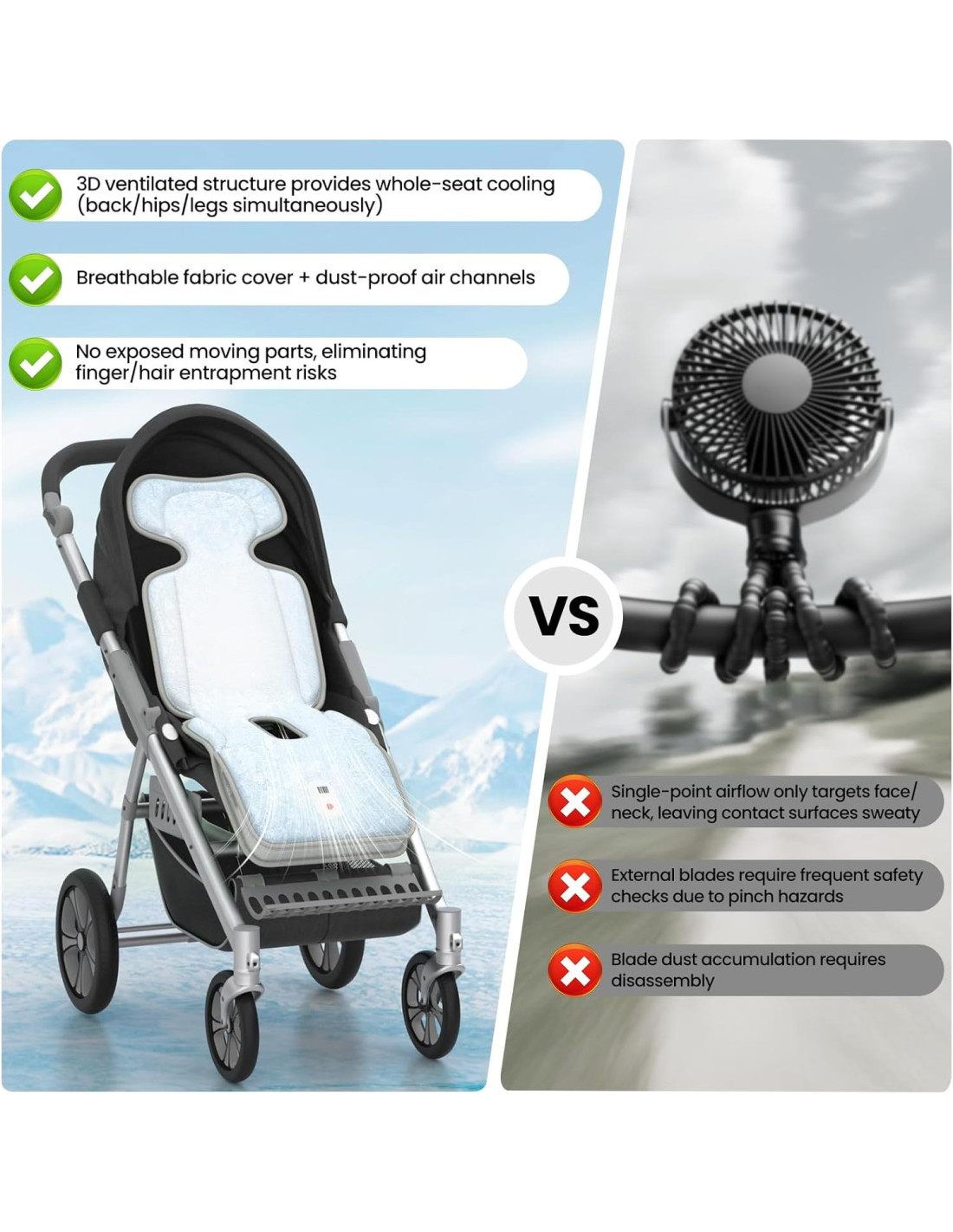 - Efecto de enfriamiento 1+1>2. Nuestra estructura ventilada 3D proporciona enfriamiento en todo el asiento (espalda/caderas/piernas simultáneamente), mientras que los ventiladores de cochecito tradicionales solo proporcionan flujo de aire de un solo punto (cara/cuello), dejando las superficies de contacto sudorosas. Mientras cada solución funciona de manera independiente, su combinación crea un efecto de enfriamiento innovador 1+1>2 al trabajar en conjunto para mantener un enfriamiento de 360 alrededor.